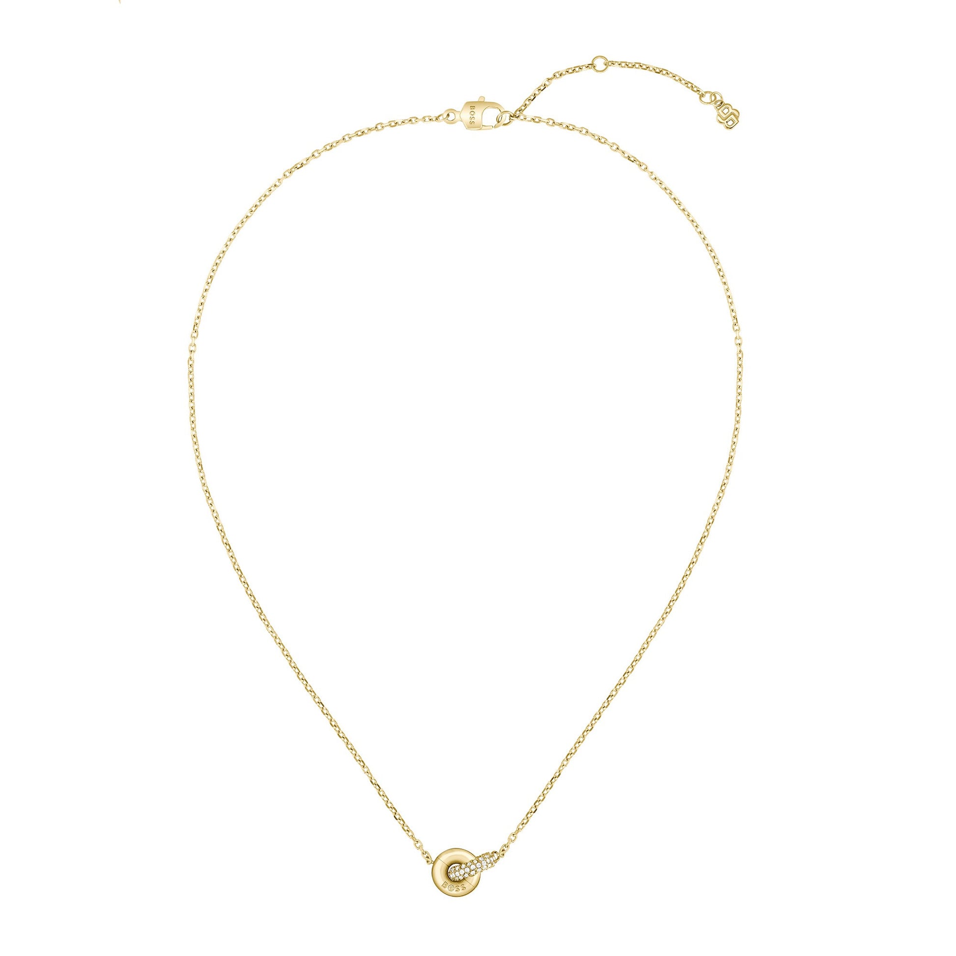 Meet the BOSS Live Precious Gold-Plated Circle Link Pendant Necklace 1580755, a refined accessory crafted for the modern woman. Made from sturdy stainless steel with a luxurious gold-plated finish, this necklace blends elegance with lasting durability.