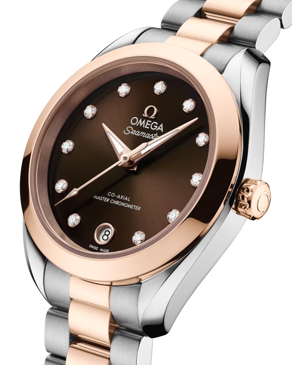 The brown dial is sun-brushed, PVD colour-treated and lacquered, with a circular date window at 6 o’clock. It is highlighted by 11 diamond hour markers and redesigned faceted hands, with the minute hand tapering to a delicate point. All the applied elements and hands are in 18K Sedna™ Gold, while the hands are also filled with white Super-LumiNova which emits a blue glow.
