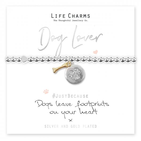 This gorgeous stretch bracelet is made from silver plated beads with a sparkling paw print and gold bone charm. It comes on a gift card with the words Dogs Leave Footprints On Your Heart