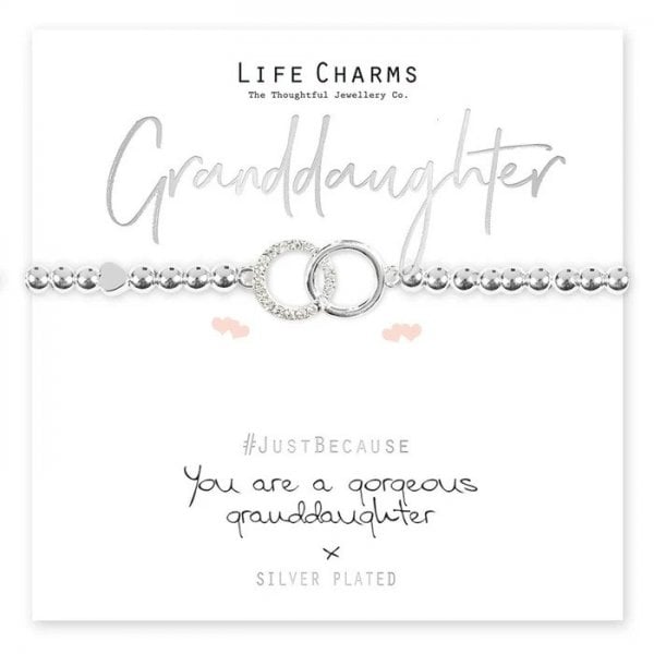 Pure silver plated bracelet with linked crystal encrusted circle charm, on 5mm beaded stretch bracelet. Charm measures 2cm x 1cm The bracelet comes presented in a luxury gift box, with a Just Because 'You Are A Gorgeous Granddaughter' reversible card.