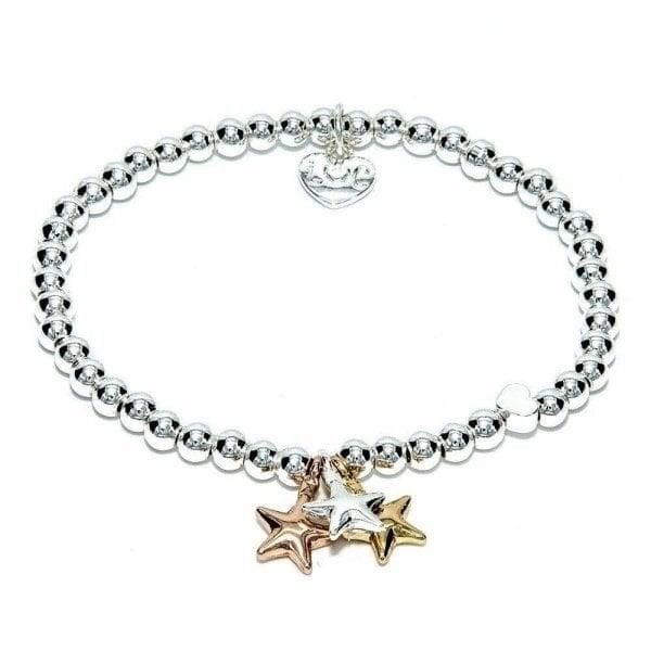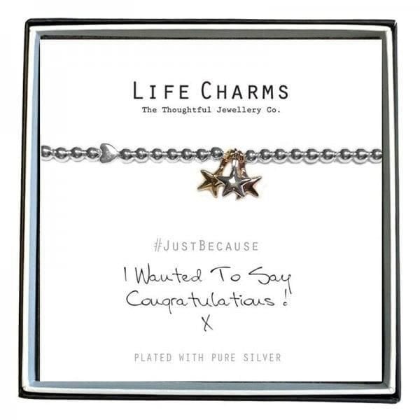 Pretty silver plated bracelet with mixed metal stars charms on 5mm beaded stretch bracelet. The bracelet comes presented in a luxury gift box, with a Just Because 'I Wanted To Say Congratulations' card. All jewellery is finished to the highest standard &
