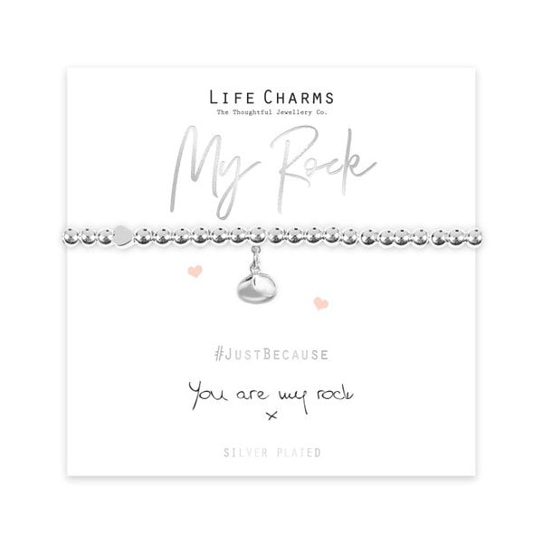 Beautiful silver plated rock charm with on 5mm beaded stretch bracelet. The bracelet comes presented in a luxury gift box, with a Just Because 'You Are My Rock' card. All jewellery is finished to the highest standard & E-coated to prevent any tarnishing.
