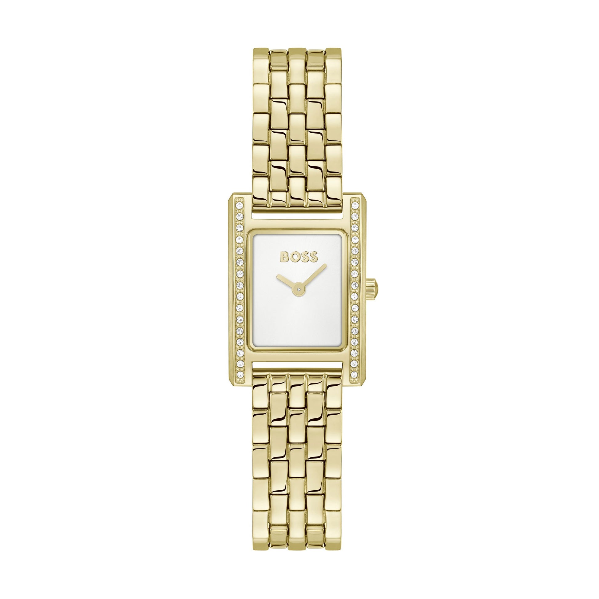 Exuding elegance and sophistication, the BOSS Lucy Precious Gold Tone Crystal Rectangle Ladies Watch 1502815 is a statement of timeless glamour. Its sleek silver dial is beautifully complemented by a crystal-embellished rectangular case, offering a refined sparkle that elevates any ensemble. Crafted from stainless steel with a luxurious gold PVD finish, this watch combines durability with high-end style. The bracelet strap with a secure folding clasp ensures a comfortable fit, while the mineral crystal glass provides lasting protection. Water-resistant up to 30 metres, this exquisite timepiece is the perfect blend of everyday practicality and classic sophistication.