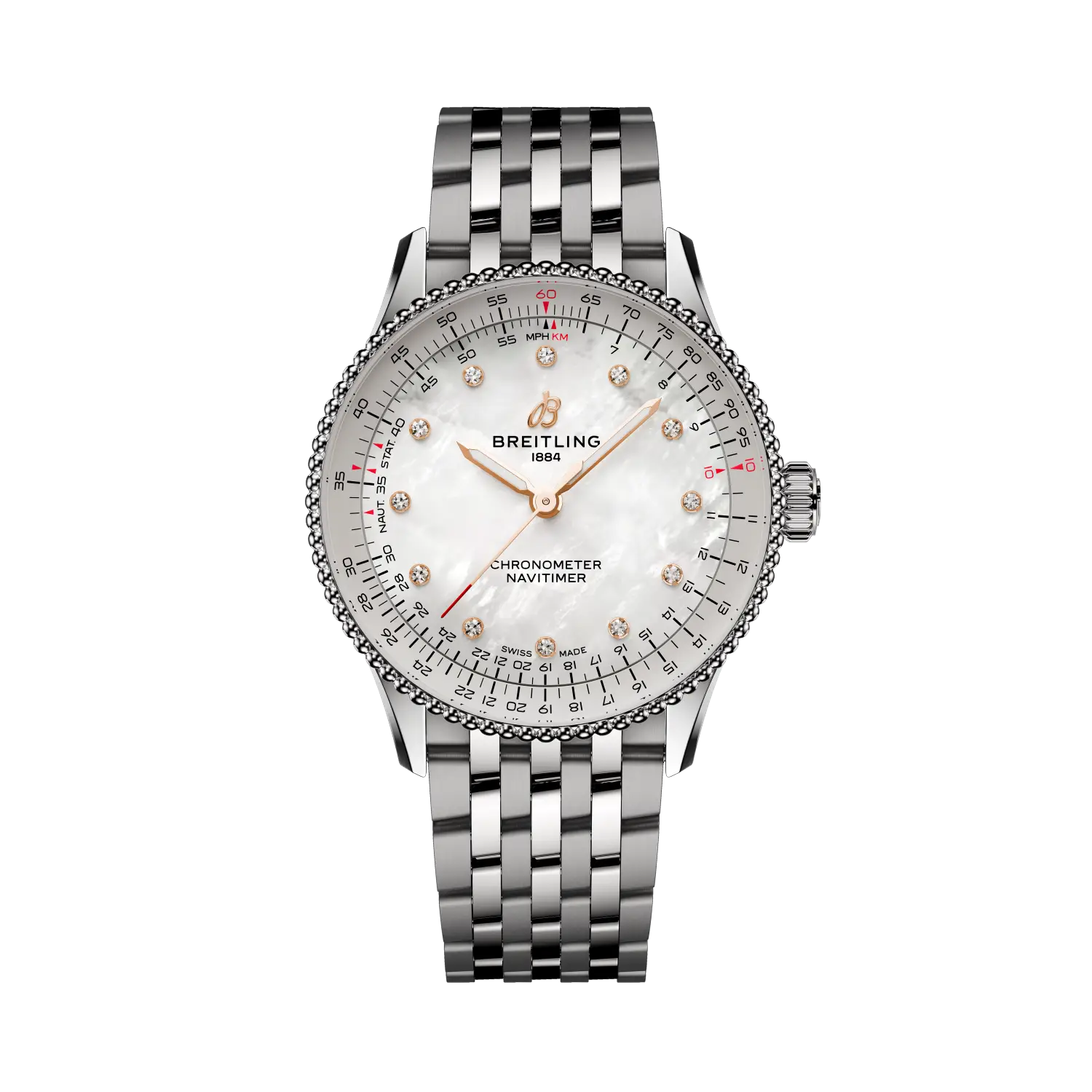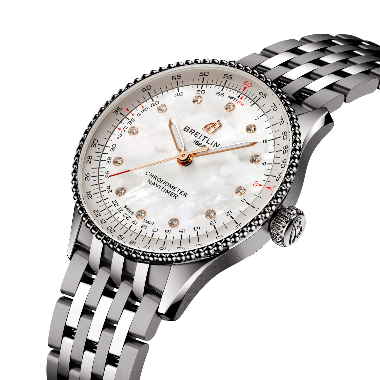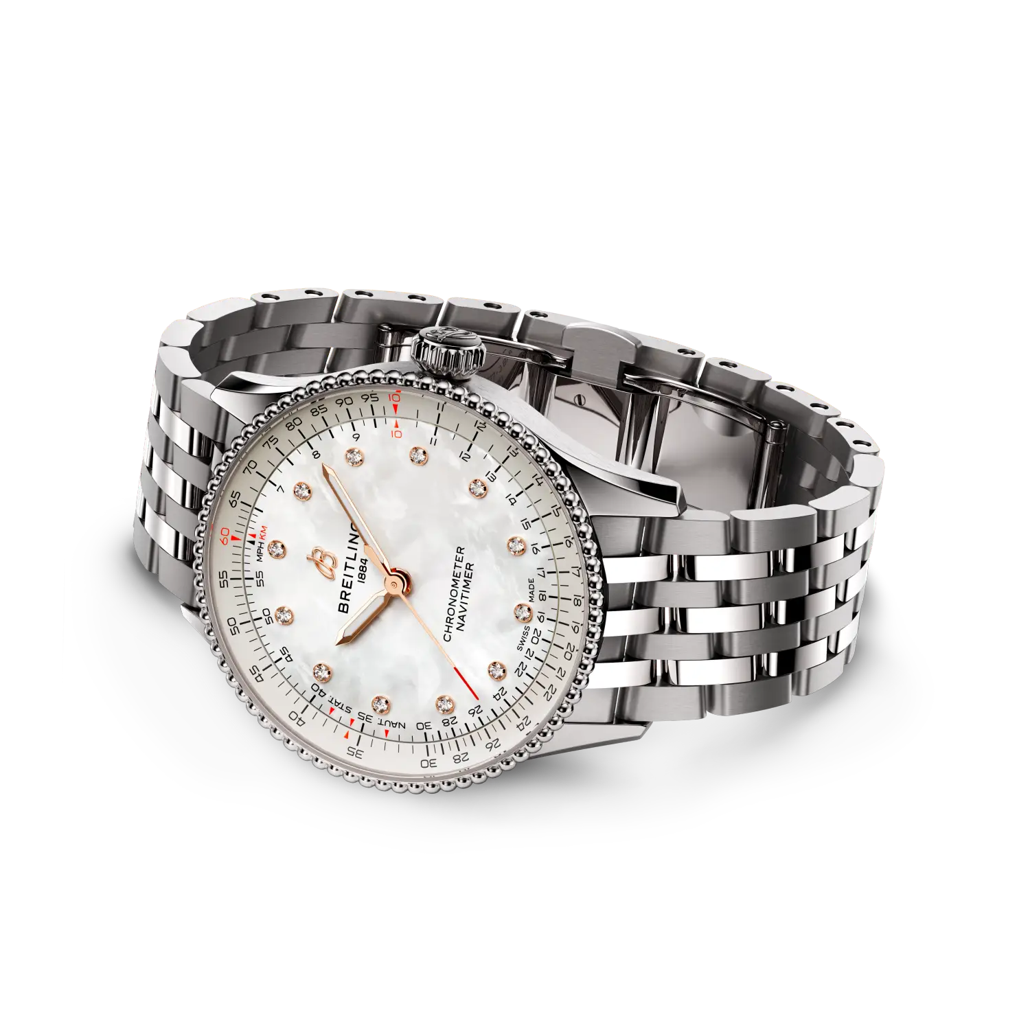 Crafted in stainless steel with warm 18 K red gold accents, this model features a white mother‑of‑pearl dial set with 12 lab‑grown diamond hour markers, marrying technical heritage with a touch of jewellery sophistication. A bidirectional slide rule bezel honors the Navitimer’s aviation legacy, while still fitting seamlessly into daily life.