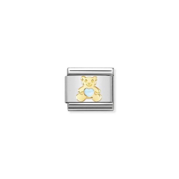 This charming link features a darling teddy bear motif in bonded gold, with a heart‑shaped centre filled with blue enamel detail. Crafted from durable stainless steel, it’s made to slide beautifully into your Nomination bracelet and become part of your personal story.