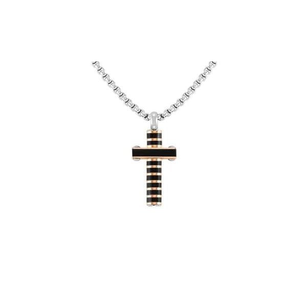 Stainless steel rose gold colour black inlaid ribbed cross pendant on stainless steel link chain with carabiner fastener.