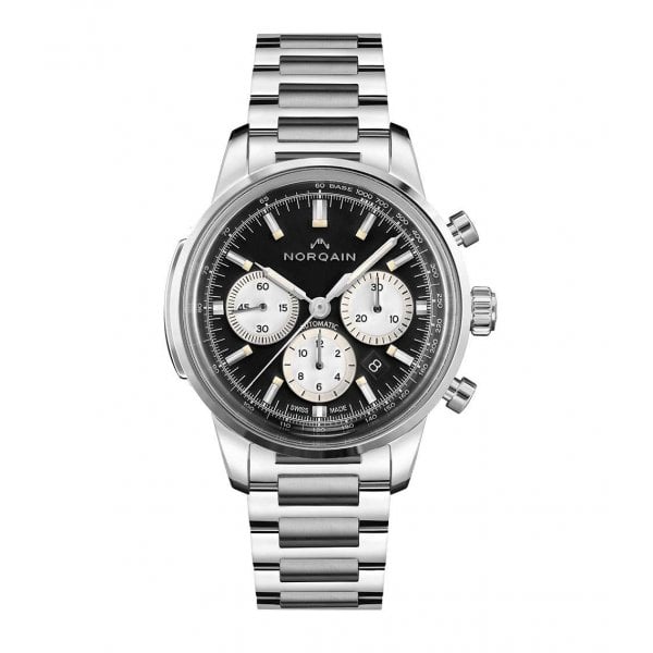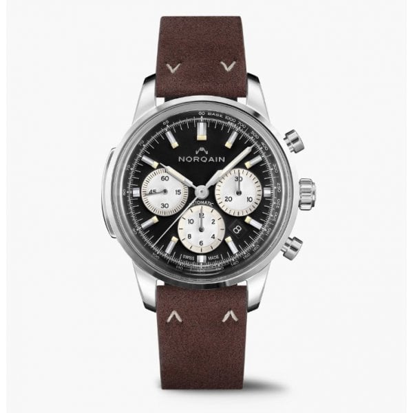Equally clean-cut and functional, this Freedom 60 Chrono has a black dial with white sub-dials at 3, 6 and 9 oclock. A date window can be found between 4 and 5 oclock. This 43mm stainless steel chronograph has a smooth matching bezel. The Norlando leather strap has the characteristic NORQAIN stitches, resembling mountain tops, near the lugs choose from a range of colors. The automatic-winding NORQAIN caliber NN18 inside is visible through the sapphire glass caseback.