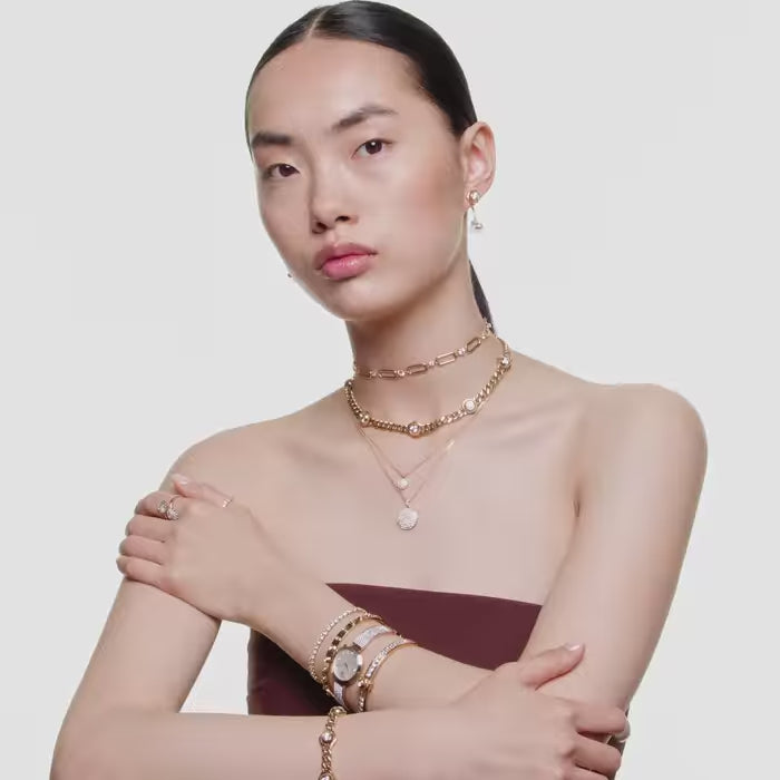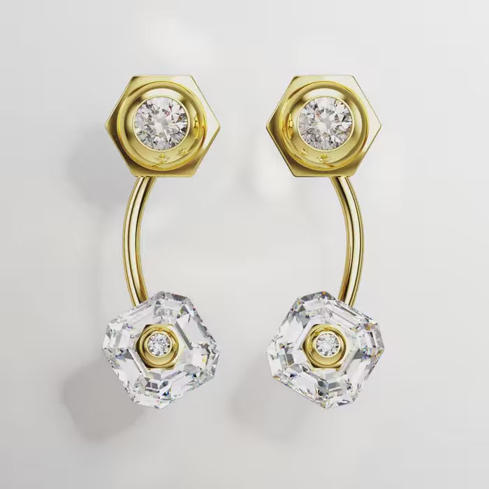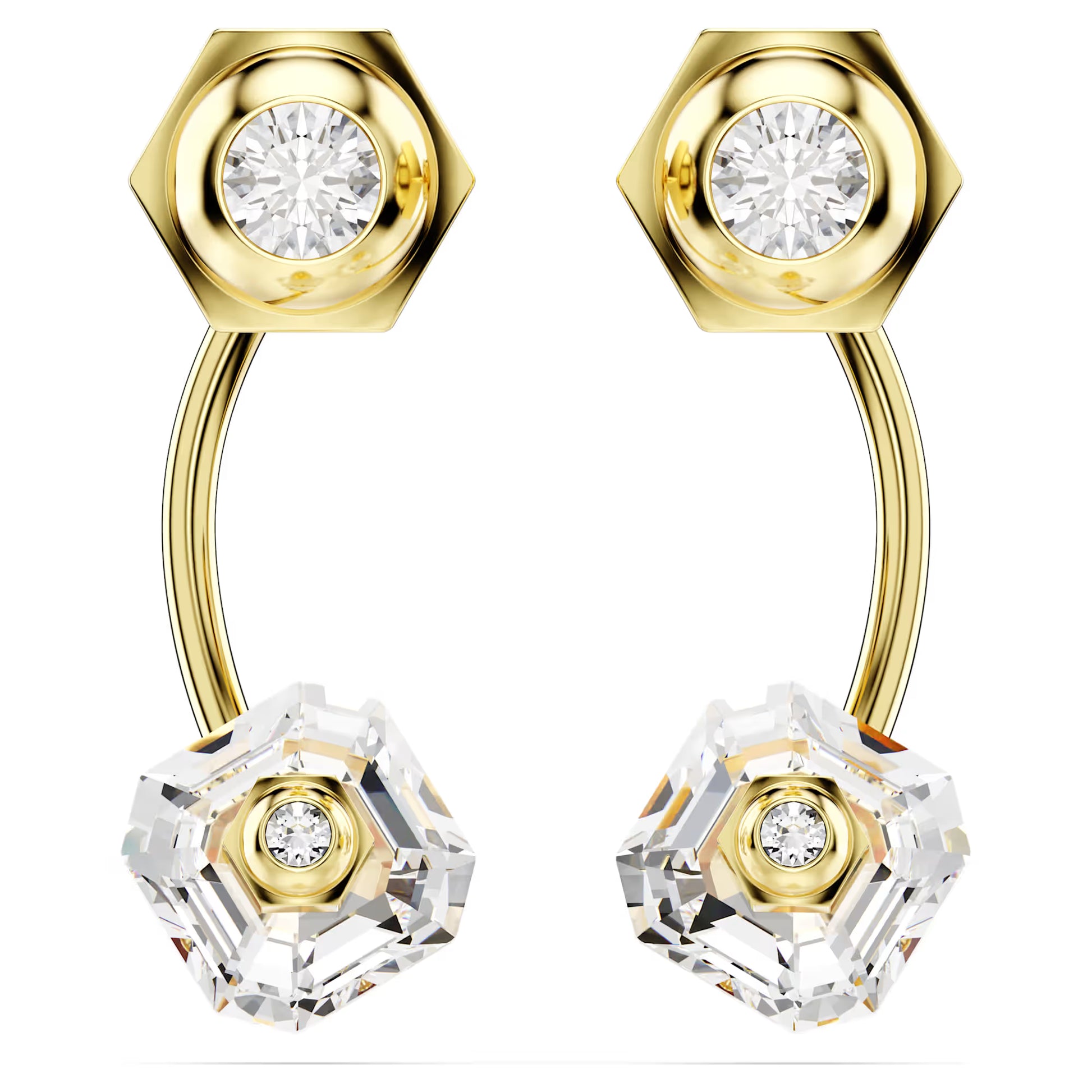 The exquisite shapes within these Numina pierced earrings give the design a truly unique character. Each gold-tone plated piece features a round Swarovski Zirconia at the top, placed within a hexagonal bezel setting. An elegant drop of curved metal then attaches to an imperial-cut crystal below, which has been pierced with metal and layered with a single Swarovski Zirconia. A sensational choice that delivers a contemporary, industrial style.