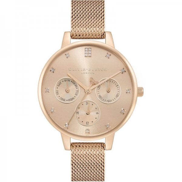 This luxe Multifunction watch contains a chronograph dial with a reflective sunray finish, creating a business-chic feel. Elegant yet unique, the dial features subtle crystal markers and our signature bee detailing on the second hand. Complete with a carnation gold mesh strap for an elevated finish.