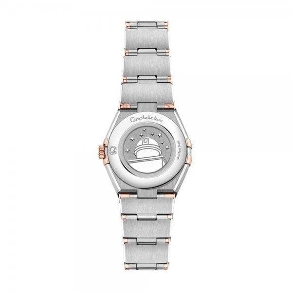 This 25 mm 18K Sedna™ gold and stainless steel model features a bezel engraved with Roman numerals, sun-brushed brown dial and scratch-resistant saphire crystal. The hands, OMEGA logo, Constellation star and diamond holders are also in 18K Sedna™ gold.