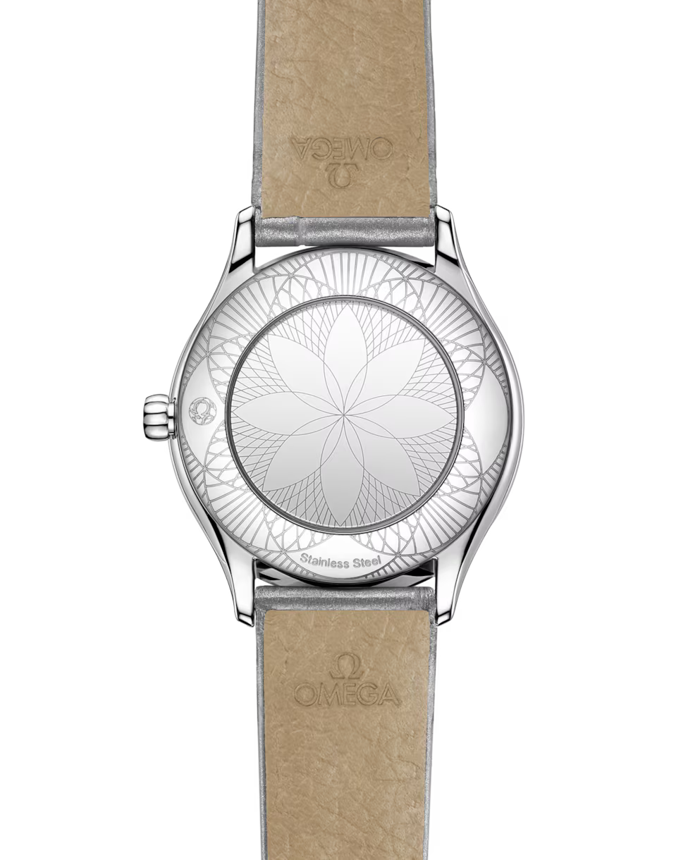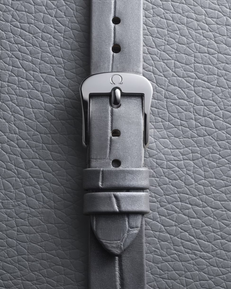 The watch is presented on a shimmering grey alligator leather strap with a Trésor buckle. It is driven by the OMEGA calibre 4061, which sits behind a special mirrored caseback with a metallised “Her Time” pattern.