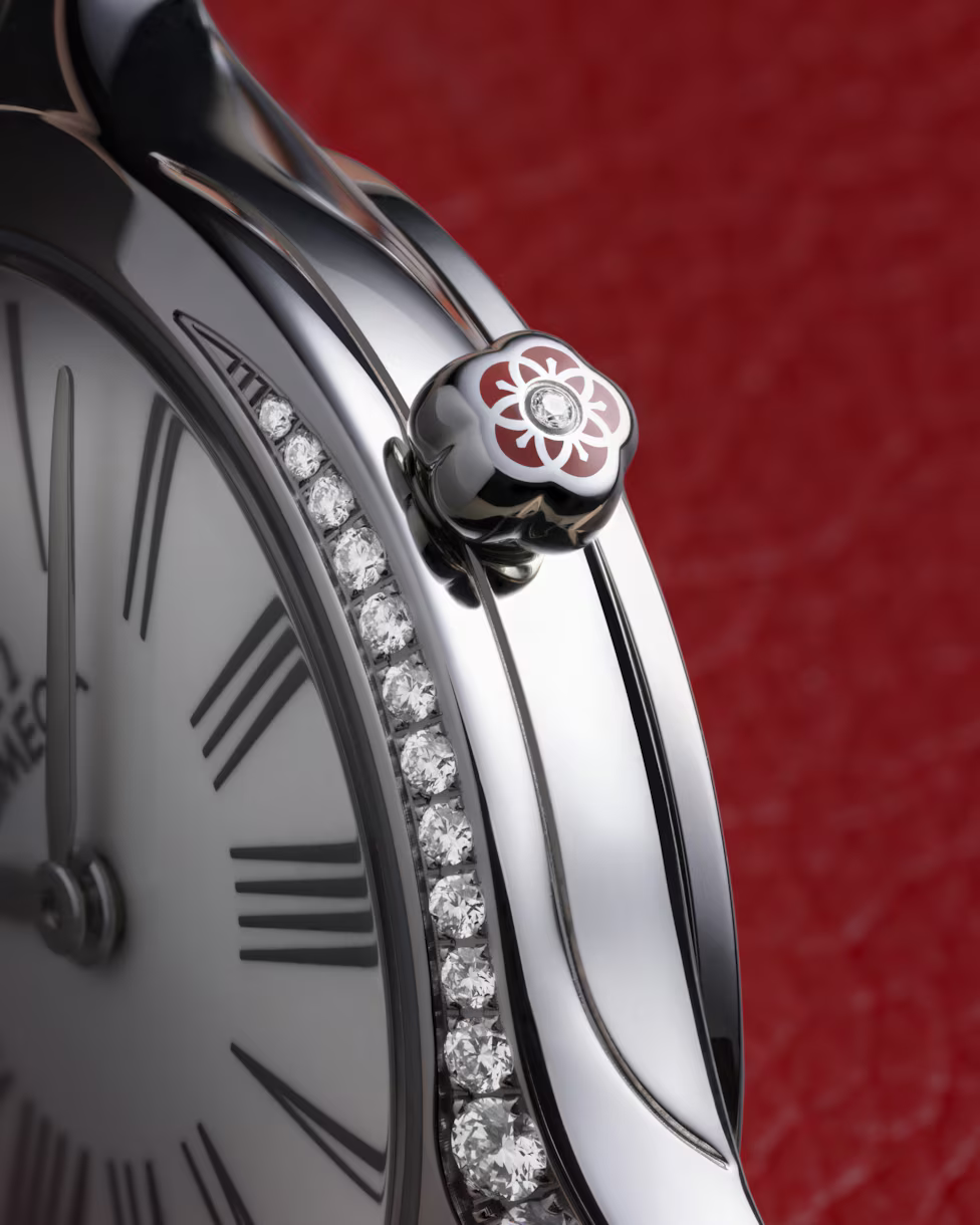 This model in stainless steel features a 26 mm case with diamonds that elegantly curve along each side. There is also a single diamond set in the crown, surrounded by a red hybrid ceramic flower. The domed dial is crafted in off-white “Grand Feu” enamel and is embellished with transferred Roman numerals in grey.