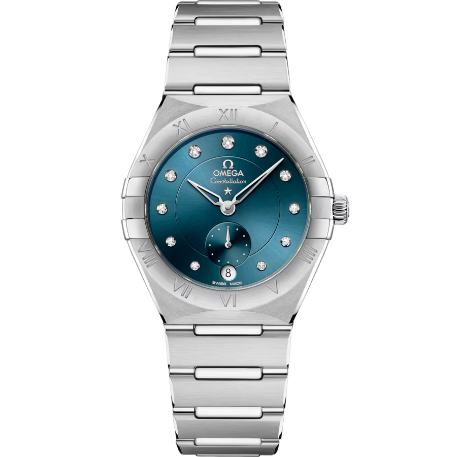This 34 mm model in stainless steel features a bezel with engraved Roman Numerals, a sun-brushed peacock blue dial, and a round date window at the 6 o'clock position. The incremental diamond hour markers are presented in 18K white gold holders, while the Small Seconds subdial and Central Minute Track are circled by rings. The hands, OMEGA logo and Constellation star are also in 18K white gold.