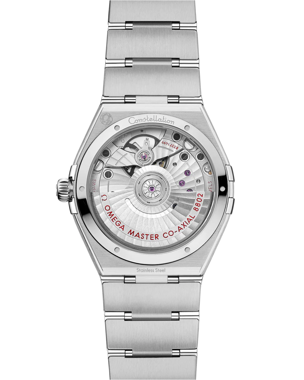 Presented on the iconic mono-rang bracelet with a butterfly clasp and easy comfort adjustment, the timepiece is driven by the OMEGA Co-Axial Master Chronometer Calibre 8802, visible through the domed scratch-resistant sapphire crystal.
