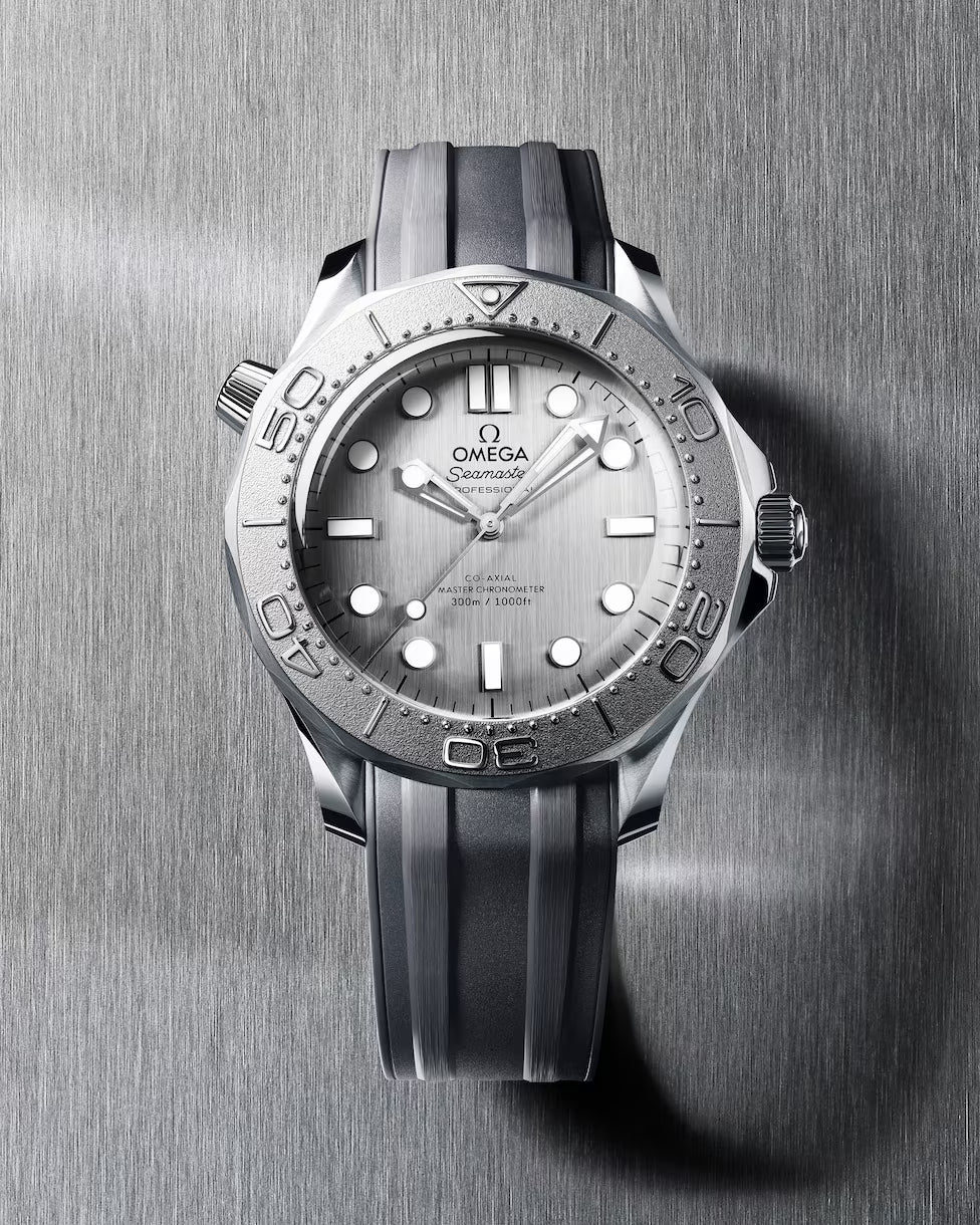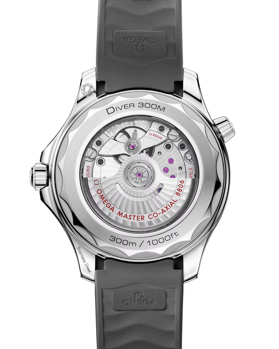 The watch is presented on an integrated grey rubber strap with foldover clasp, and is driven by the OMEGA Co-Axial Master Chronometer Calibre 8806, which can be seen through the sapphire-crystal caseback.