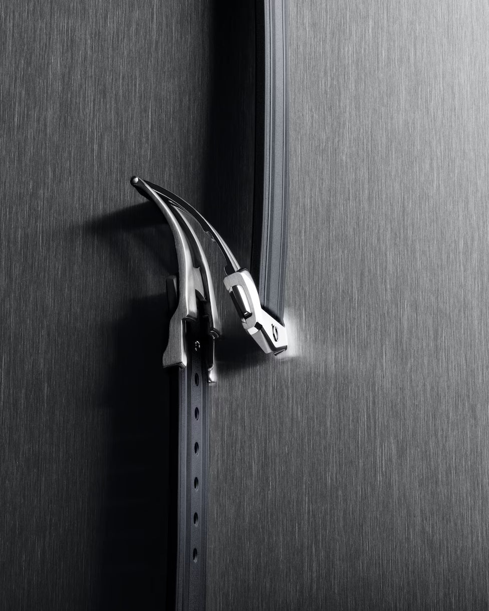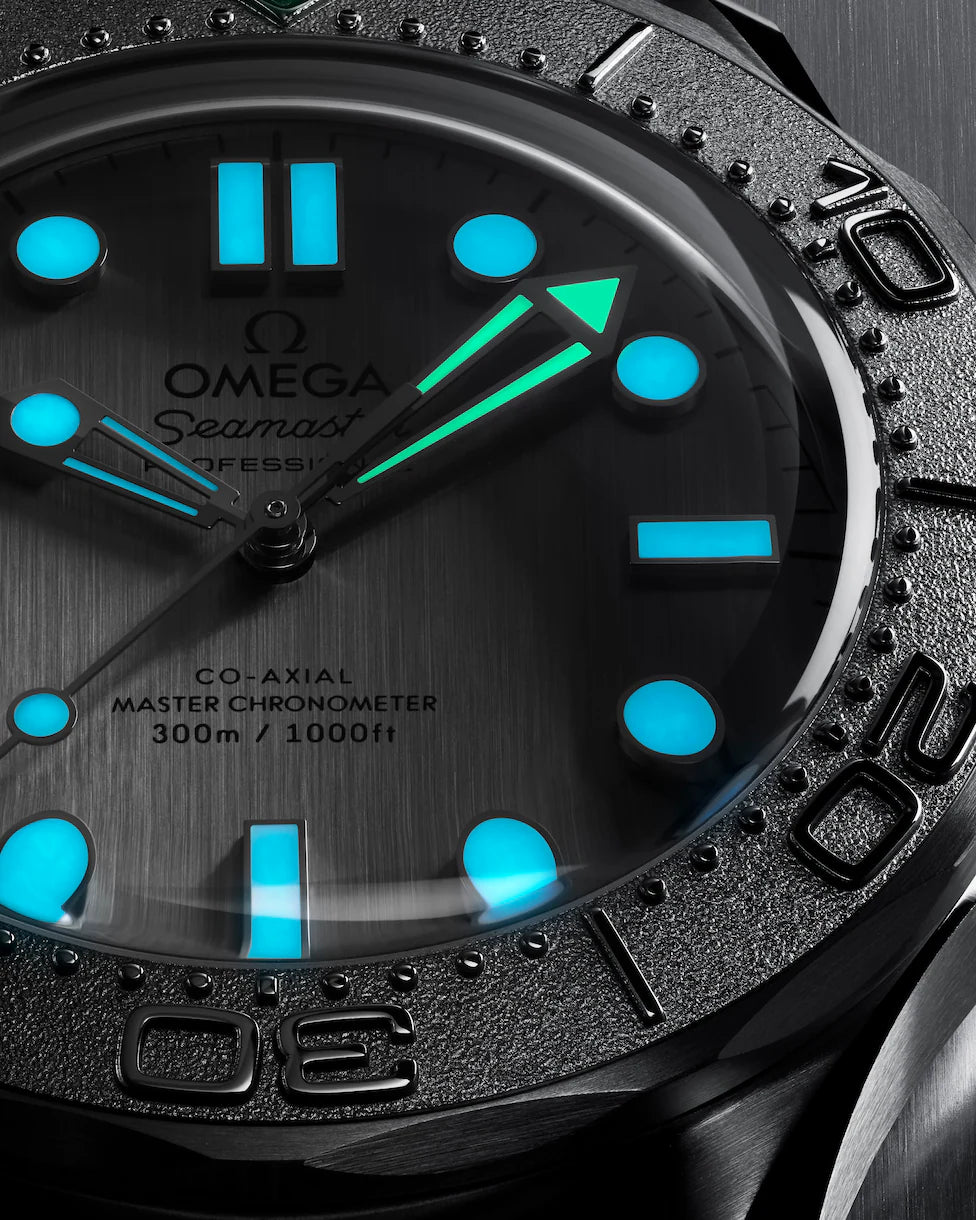 PVD stainless steel is used to create the brushed dial as well as the polished and skeletonized hands and indexes, which are filled with white Super-LumiNova. Other markings, including the OMEGA logo, are transferred in black.