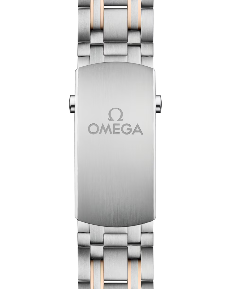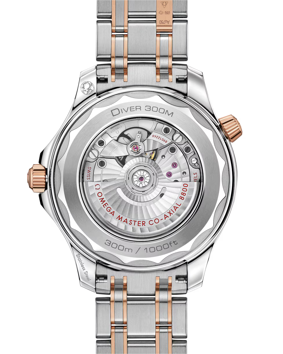The watch is presented on a stainless steel and 18K Sedna gold bracelet and is driven by the OMEGA Master Chronometer Calibre 8800, which can be seen through the sapphire-crystal on the wave-edged caseback.