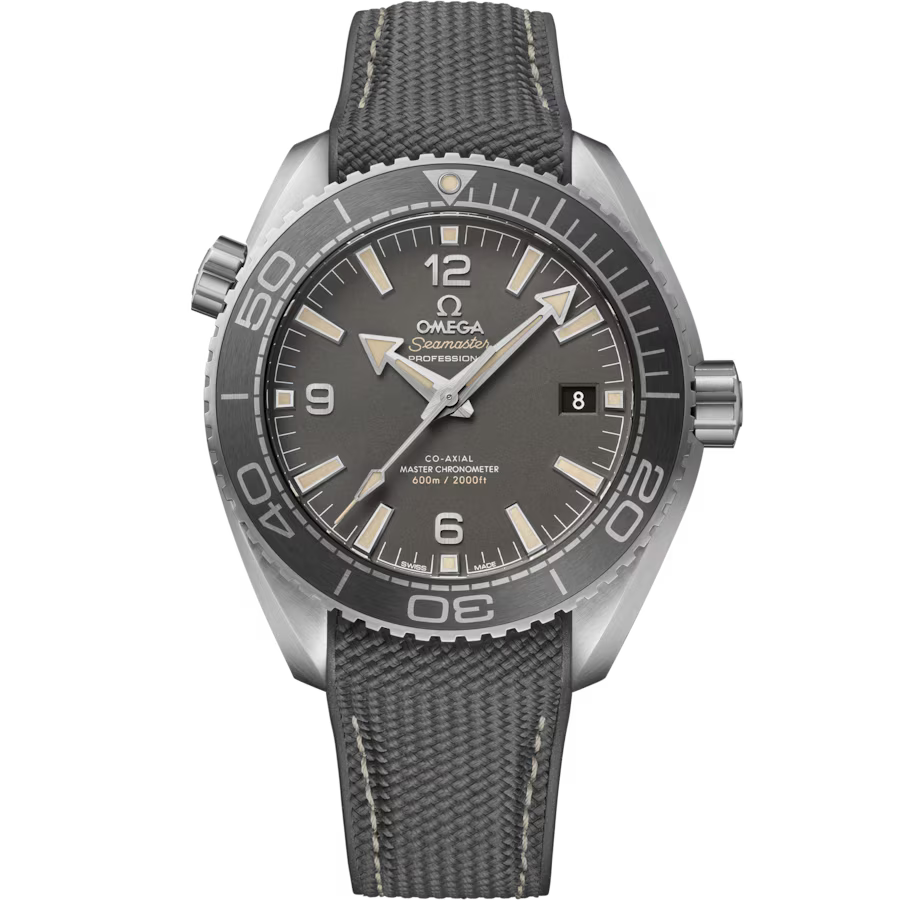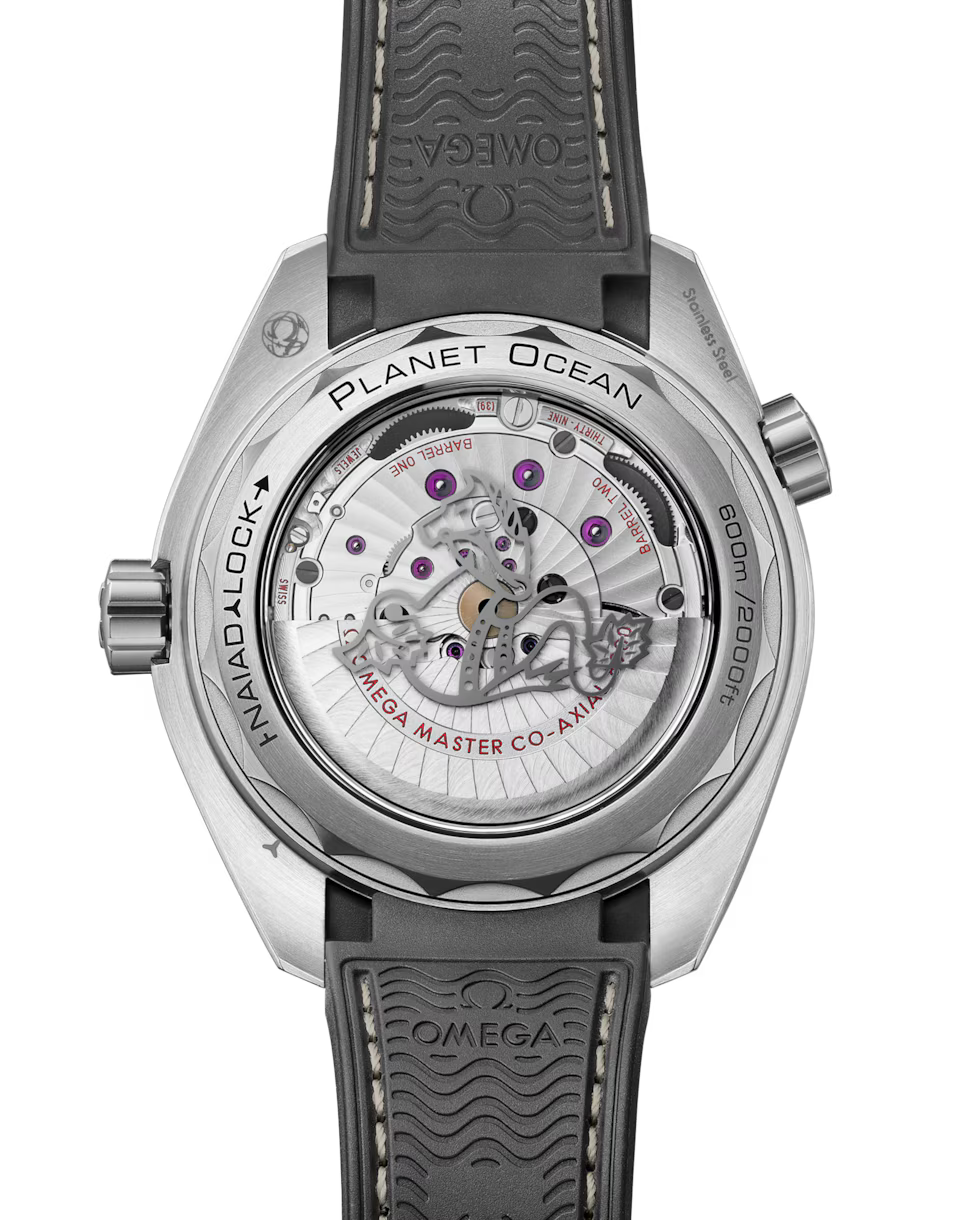 Powered by the Co-Axial Master Chronometer Calibre 8900, this Seamaster Planet Ocean is worn on an integrated dark grey rubber strap with a structured pattern and beige and dark grey stitching. The NAIAD LOCK caseback is completed with a metallized seahorse on the sapphire crystal.