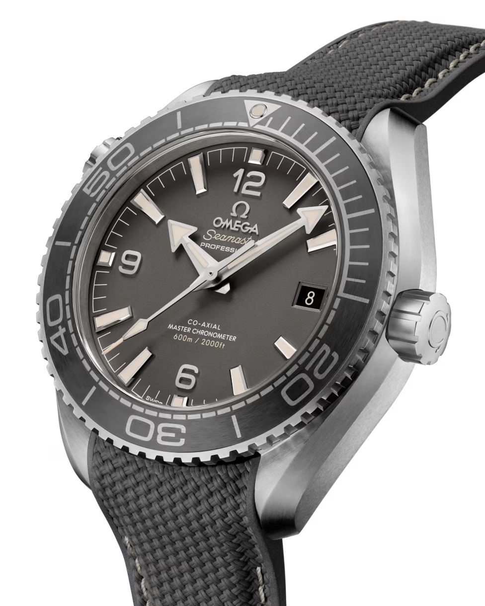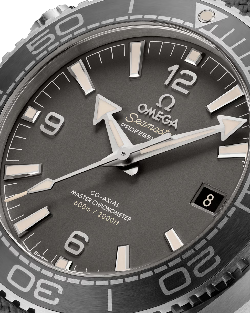 The dial is presented with a sand-blasted “gunmetal” grey galvanic treatment and includes a date window at 3 o’clock, along with transferred words in beige and white. The OMEGA logo, Arabic numerals, hands, and hour markers are all in PVD stainless steel with a brushed finish, while the beige Super-LumiNova improves visibility in dark conditions.