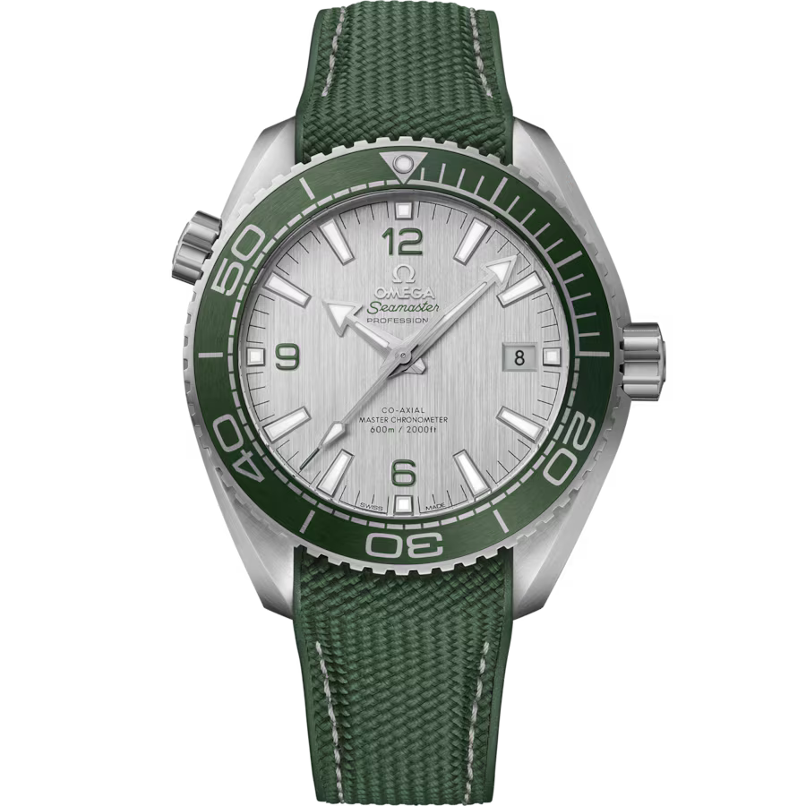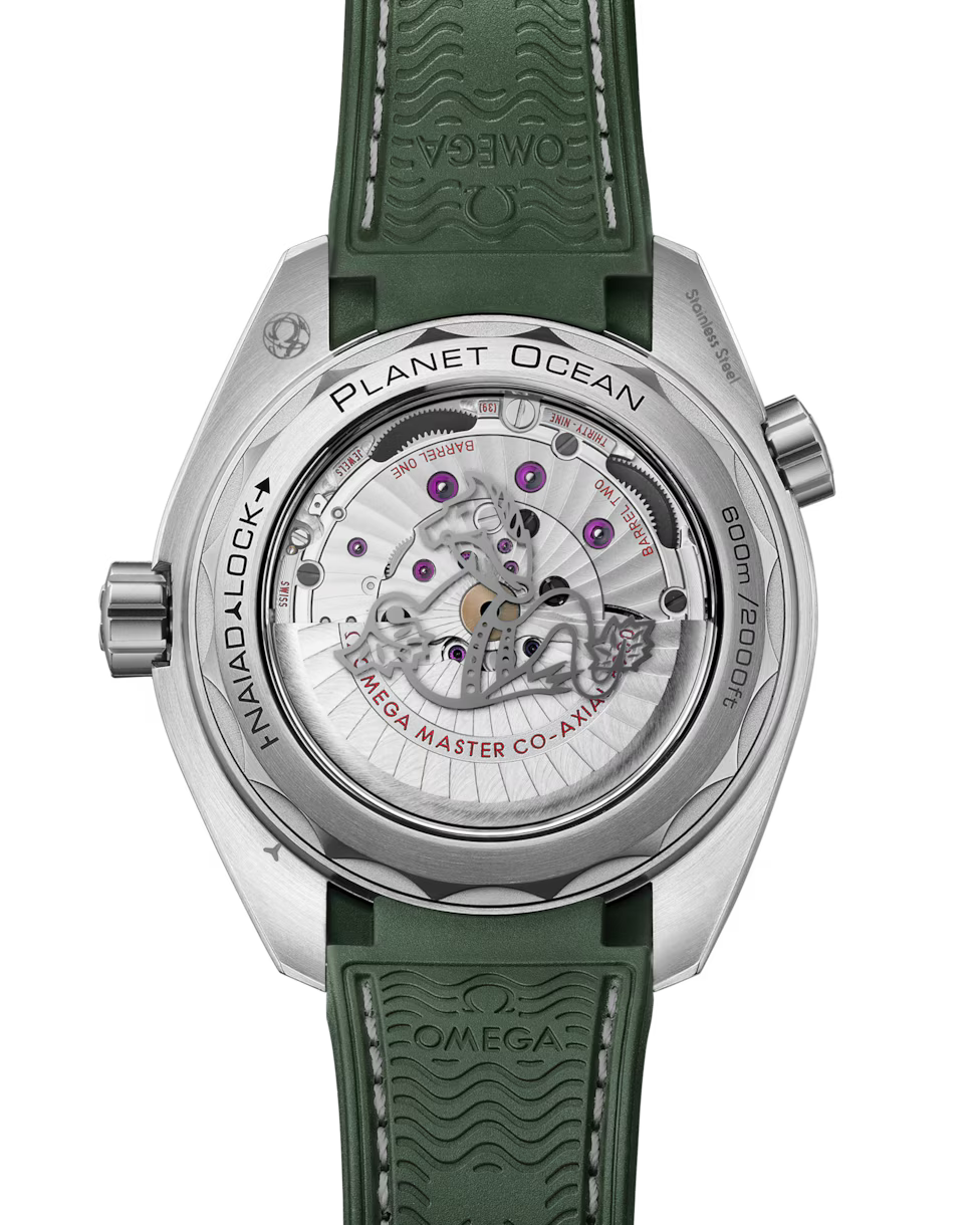 Powered by the Co-Axial Master Chronometer Calibre 8900, this Seamaster Planet Ocean is worn on an integrated green rubber strap with a structured pattern and light grey and green stitching. The NAIAD LOCK caseback is completed with a metallized seahorse on the sapphire crystal.