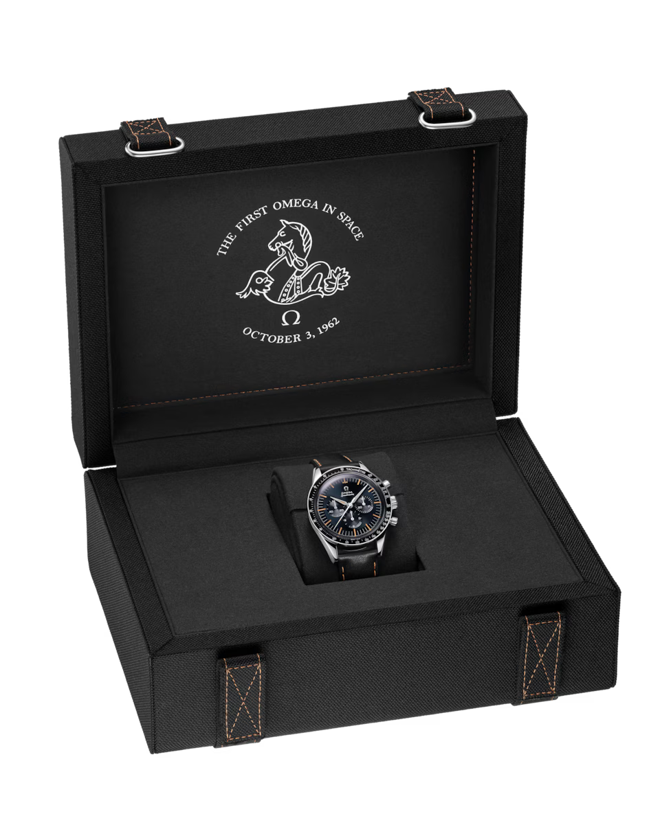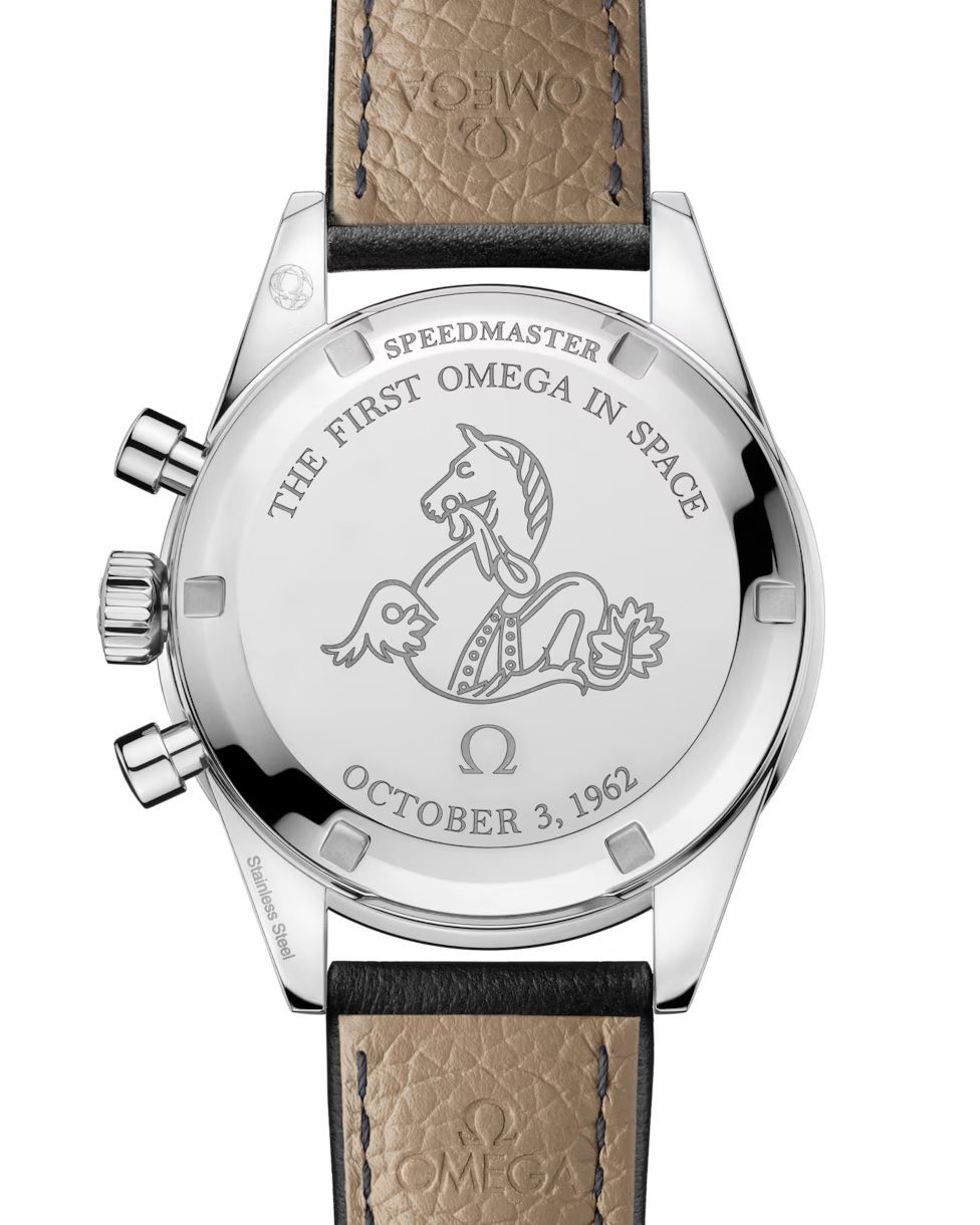 A vintage OMEGA logo is applied on the dial, as well as on the crown, while the caseback features the famous Seahorse medallion, and the engravings, “THE FIRST OMEGA IN SPACE” and “OCTOBER 3, 1962”.