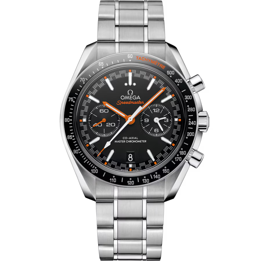 This Speedmaster Racing Master Chronometer model features a 44.25 mm stainless steel case and bracelet with a black ceramic bezel ring that includes the famous tachymeter scale in orange wording and Liquidmetal™ numbers.