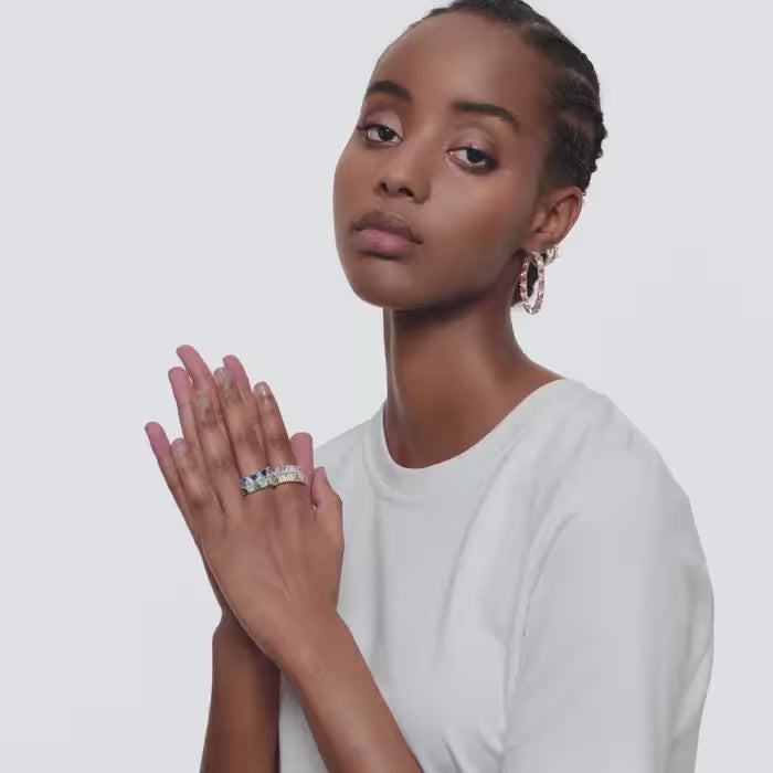 This intense blue cocktail ring makes a striking everyday adornment. It is crafted from tessellating triangle cut stones and set on a simple rhodium plated band that can easily be stacked with other rings. Try mixing yours with other vibrant colours, or let it make a statement all on its own. This ring is part of the Millenia family, designed by Creative Director Giovanna Engelbert for Collection I.