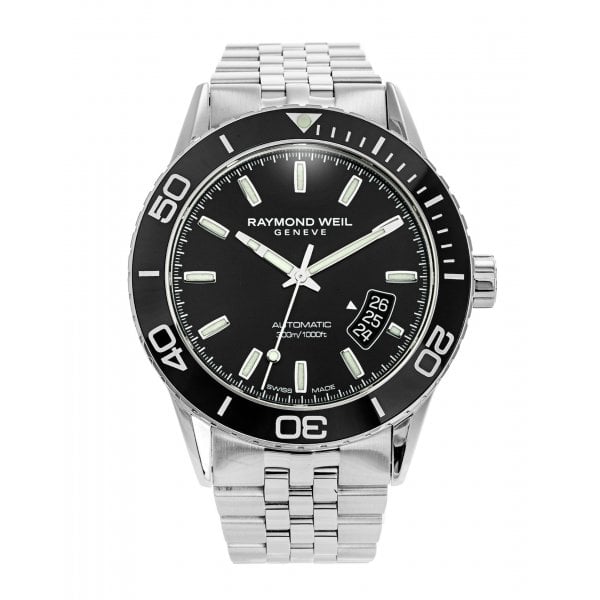 Water-resistant up to 300m, this timepiece is equipped with an automatic movement with a 38 hour power reserve. The black dial and ceramic rotating tachometer bezel add contrast to the stainless steel bracelet and case.