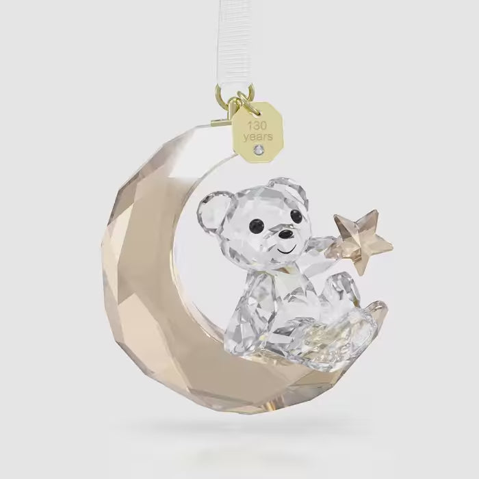 Exclusively for SCS members, this collectible celebrates Swarovski’s 130th anniversary. The heartfelt design shows the bear holding a star while relaxing on a crescent moon. Each celestial detail is crafted with Swarovski’s Golden Shadow effect, while the 486 facets of the ornament create endless light reflections. Suspended from a white grosgrain ribbon, this charming piece includes a champagne gold-tone metal tag with a single chaton and a ‘130 Years’ engraving. Decoration object. Not a toy. Not suitable for children under 15.