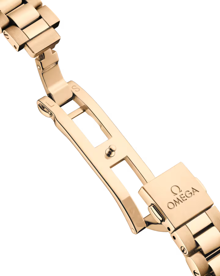 The watch is presented on an integrated 18K Moonshine™ Gold bracelet with beautifully rounded polished-brushed links, a foldover butterfly clasp, and OMEGA’s easy comfort-adjustment system.
