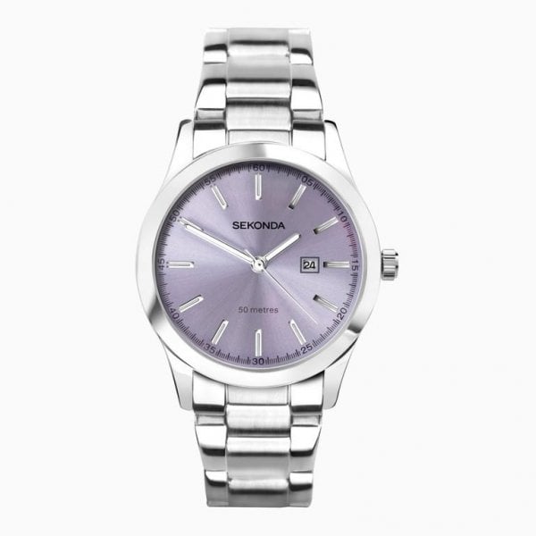 This watch features a round silver coloured alloy case housing a pale purple dial. Fastened with a stainless steel bracelet, this watch also has a date display and is water resistant up to 50 metres.