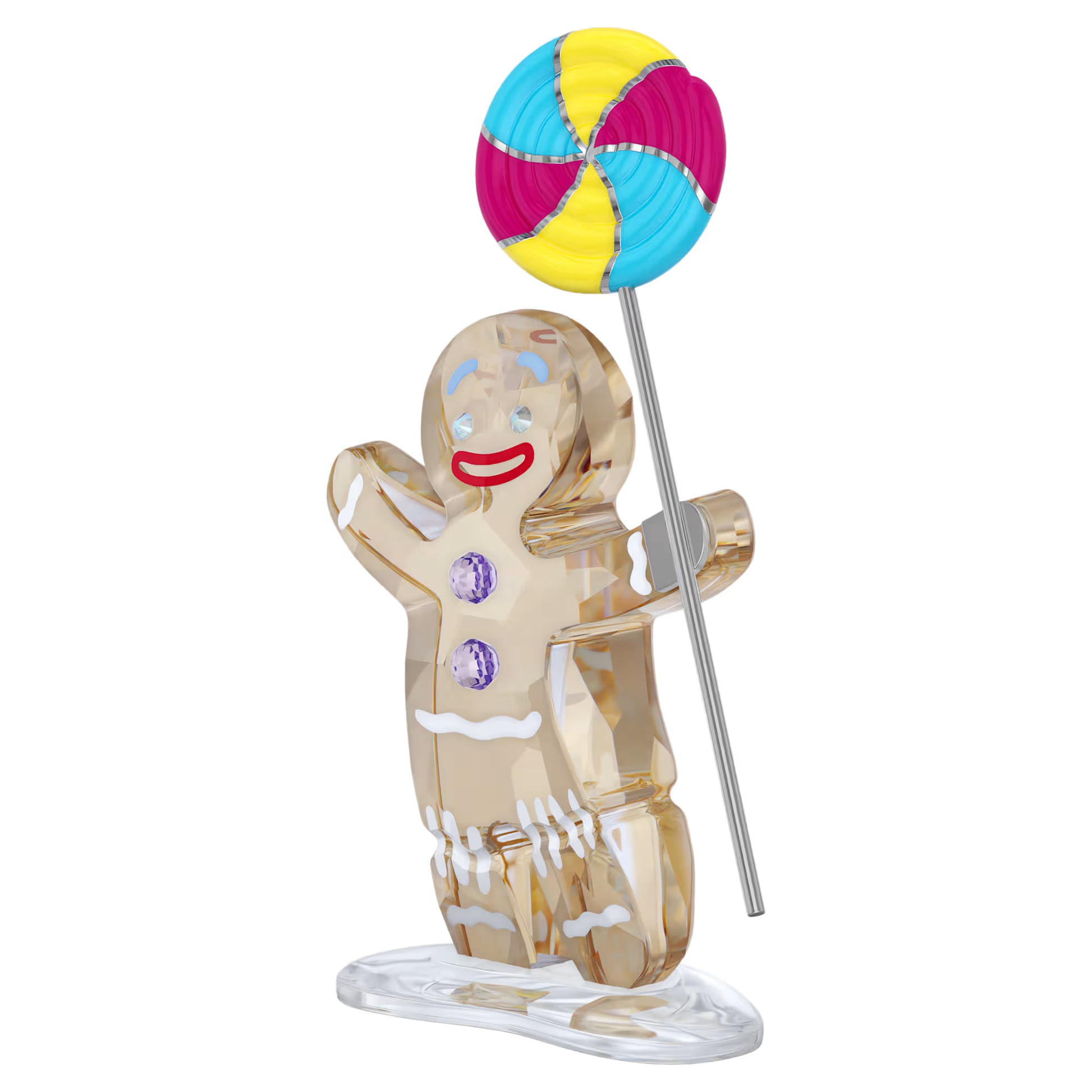 Embark on a whimsical journey to the kingdom of Far Far Away, as Swarovski pays tribute to the iconic film from DreamWorks Animation, Shrek. The collectible series includes this Gingy figurine, which captures the feisty yet sweet-voiced cookie in signature detail. Crafted with 209 facets, the design uses a variety of colours to emphasise the fan-favourite character and his lollipop, while distinctive prints and crystal buttons add vibrancy to his cheery personality. Give your own interior a touch of the swamp, or gift this figurine to a Shrek fan who loves adventure and imagination. Decoration object. Not a toy. Not suitable for children under 15.