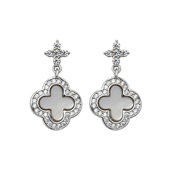 Silver Mother Of Pearl & Cz Clover Drop Earrings