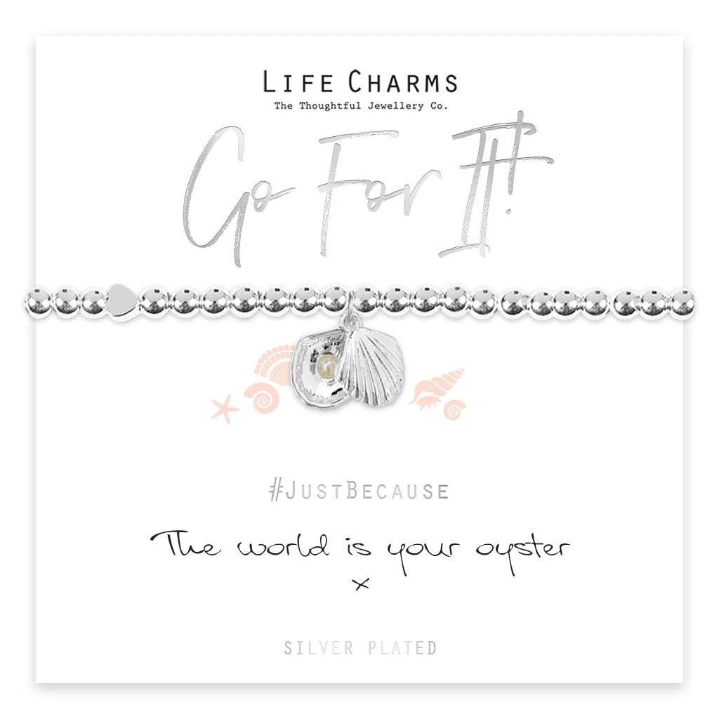 A beautiful and delicate 5mm silver plated stretch bracelet, with oyster shells and pearl hanging charms.