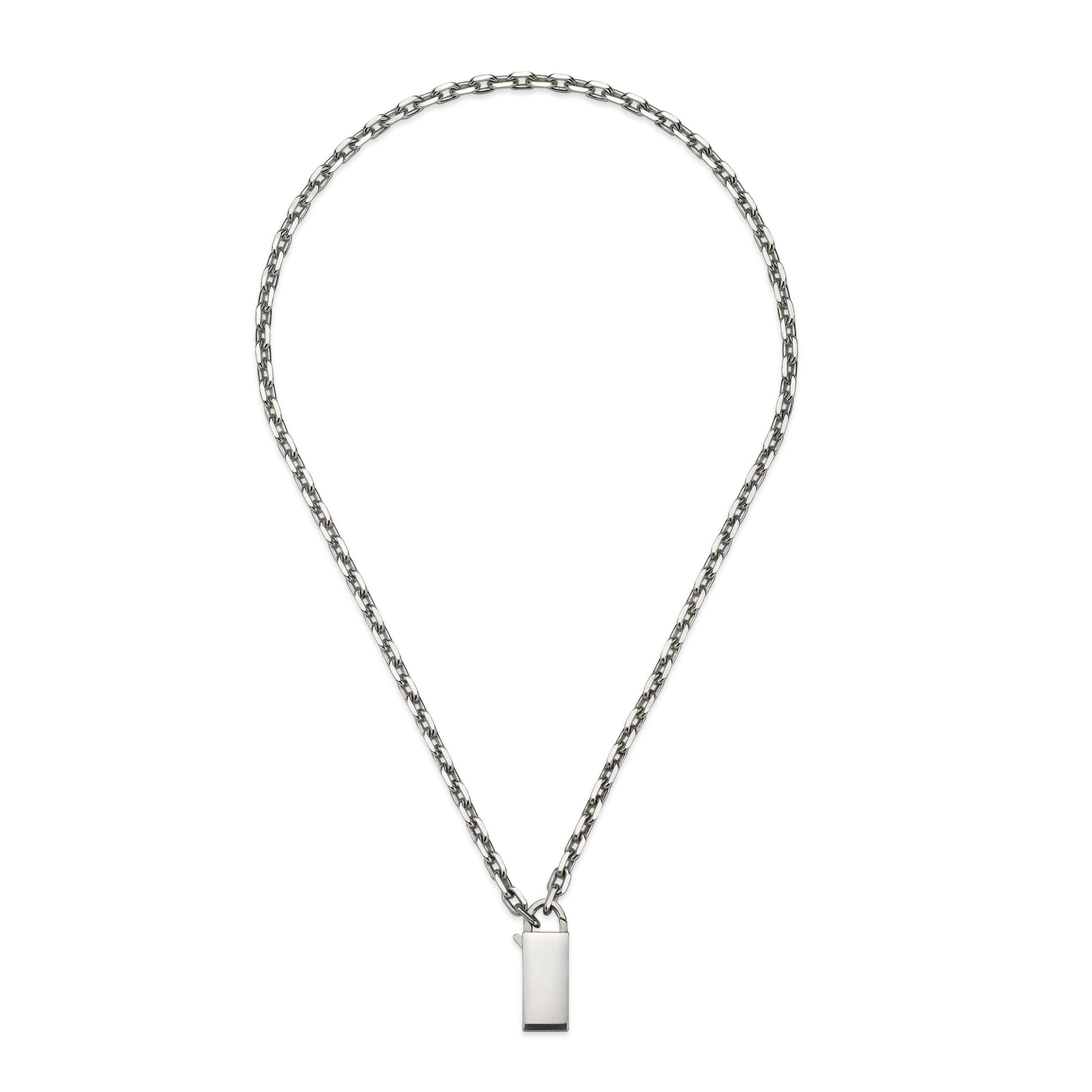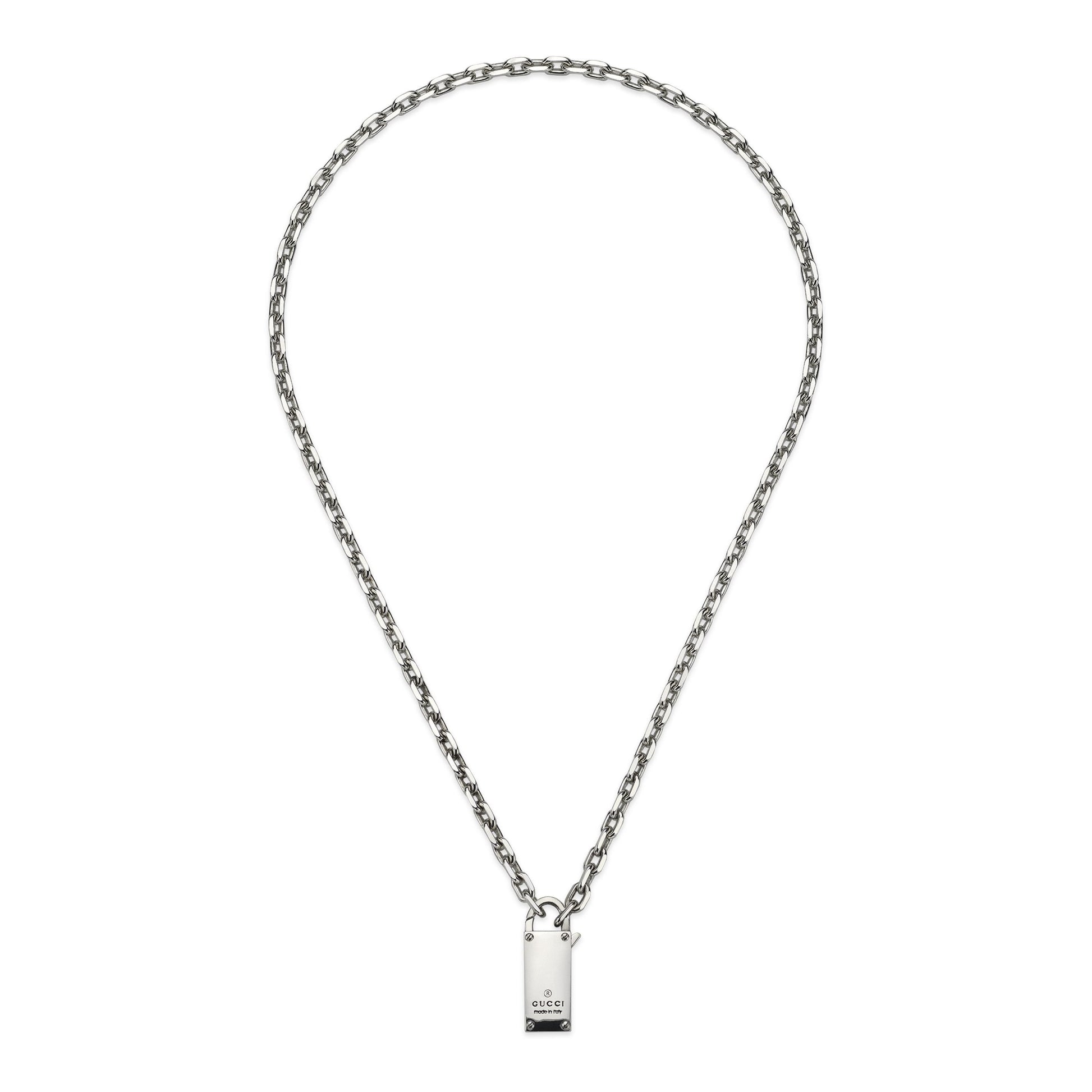 Lock in timeless style with this Gucci padlock pendant necklace from the Trademark collection. Crafted in 925 sterling silver, its 50 cm chain features a padlock motif that doubles as the clasp — a clever touch combining elegance and function. Made in Italy, this piece blends bold symbolism with refined jewellery craftsmanship, perfect for both everyday wear and standout moments.