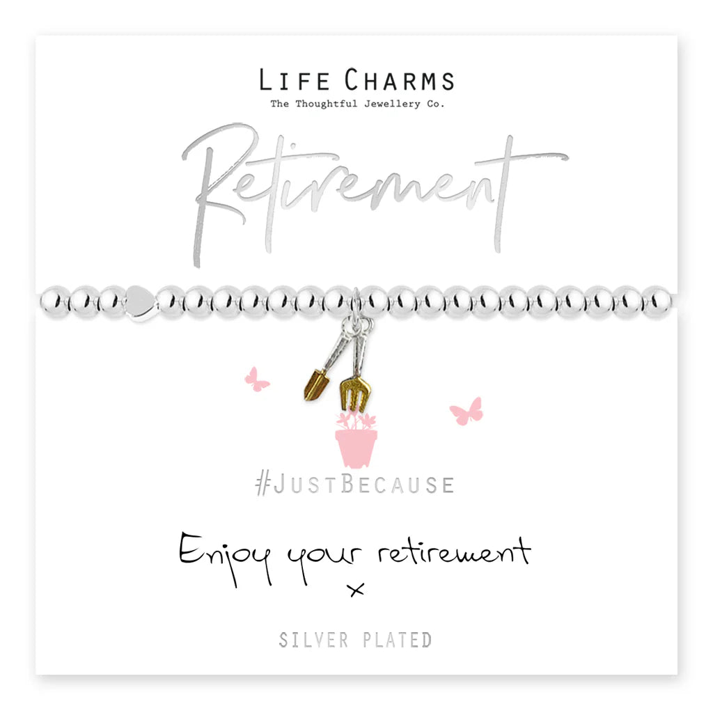 Silver and gold plated garden fork and spade charms, presented on a 5mm silver plated beaded stretch bracelet. The bracelet comes on a #Just Because card with 'On Your Retirement' printed on it and presented in a luxury gift box.
