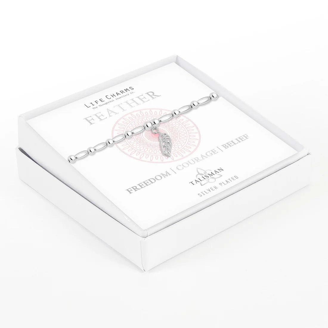 This stylish Talisman bracelet has a gorgeous silver plated feather charm.