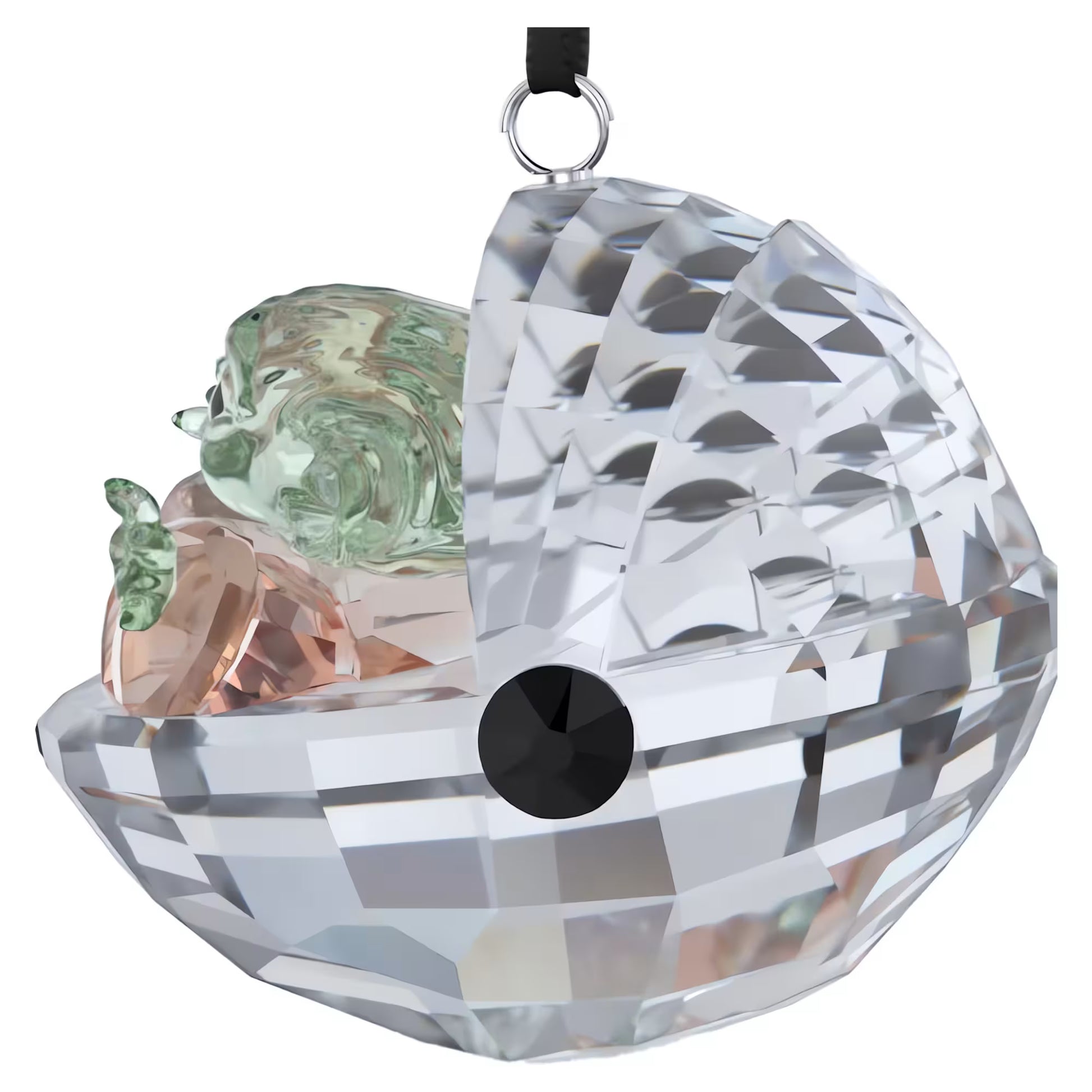 Swarovski's remarkable savoir-faire is on full display in this luminous ornament inspired by Grogu, the foundling from the Star Wars Disney+ original television series The Mandalorian. Cut with 535 facets in an array of coloured crystals, the enchanting character-inspired design sits in its hovering pram and is suspended on a black grosgrain ribbon. Decoration object. Not a toy. Not suitable for children under 15.
