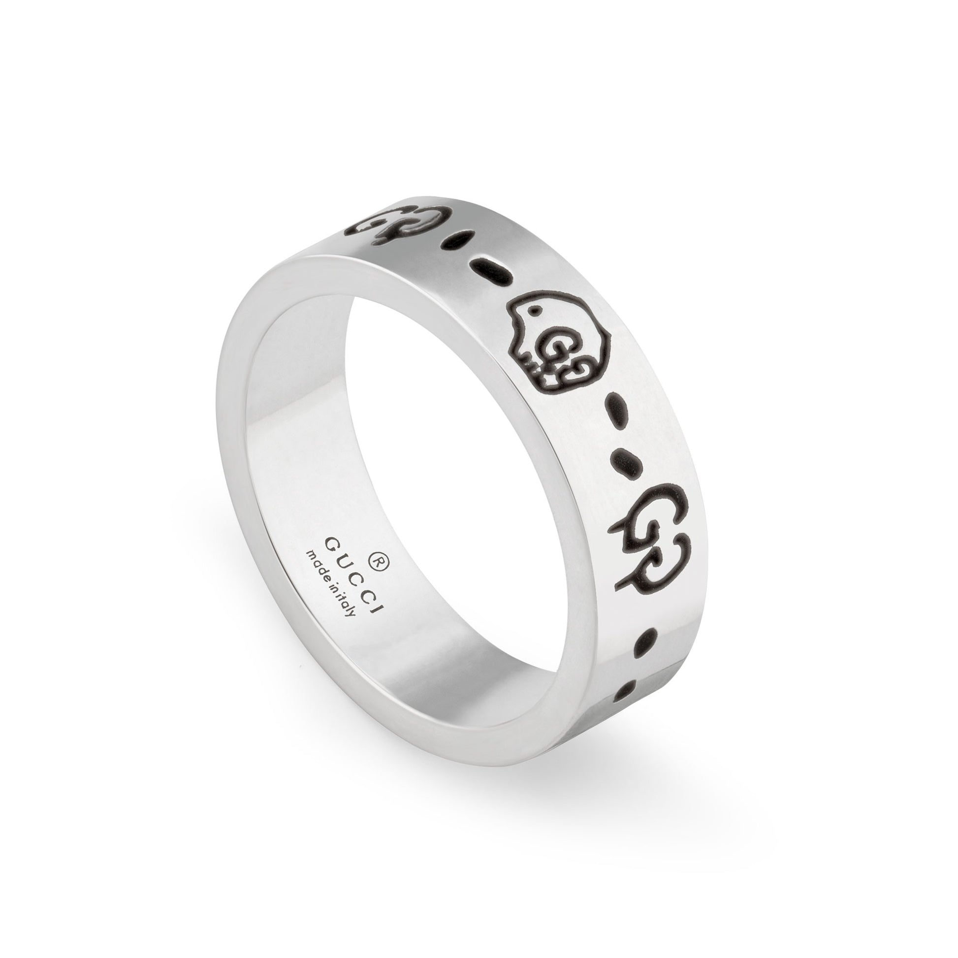 Show off your style with a piece that’s bold, playful, and unmistakably Gucci. This 4 mm band, crafted in high‑quality 925 sterling silver, features the iconic GucciGhost motif — including the signature skull and interlocking‑G “eyes” — etched into the surface for texture and depth. Its clean, slim profile makes it perfect to wear solo as a standout accessory or alongside other pieces for a layered look. Designed in Italy, it’s a striking way to add personality to any outfit.