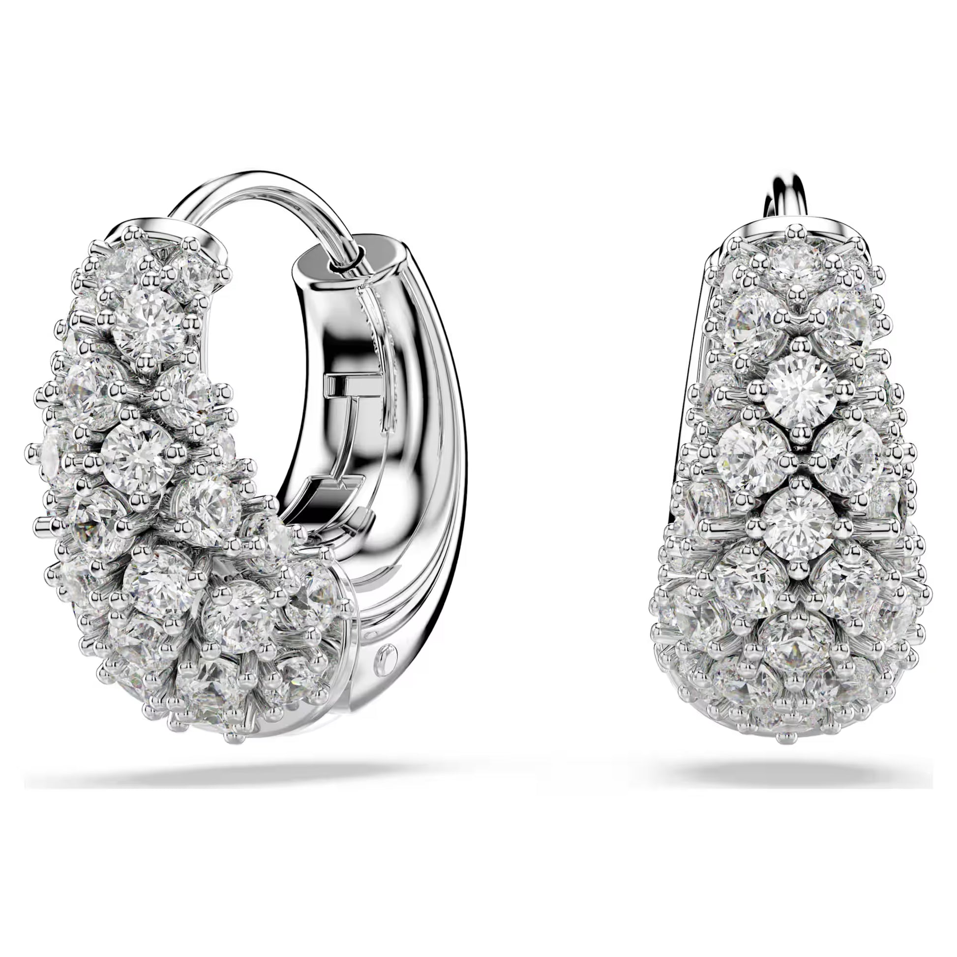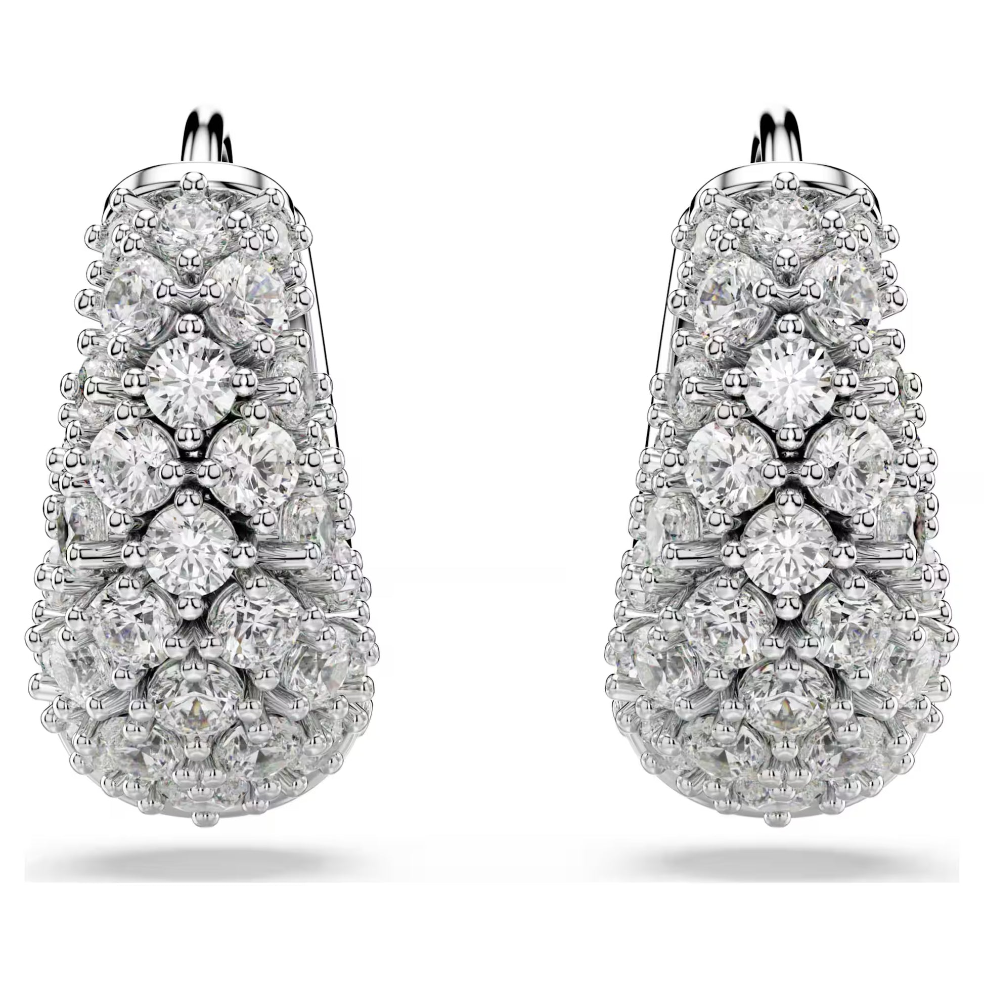 Delicate yet radiant, these shimmering earrings are rhodium plated and feature a stunning decoration of clear Swarovski Zirconia, set in place using the chatonnage technique. An additional spring plate mechanism makes them particularly easy to wear. Combine these earrings with a wondrous Sublima pendant or a ring to infuse your entire look with light.