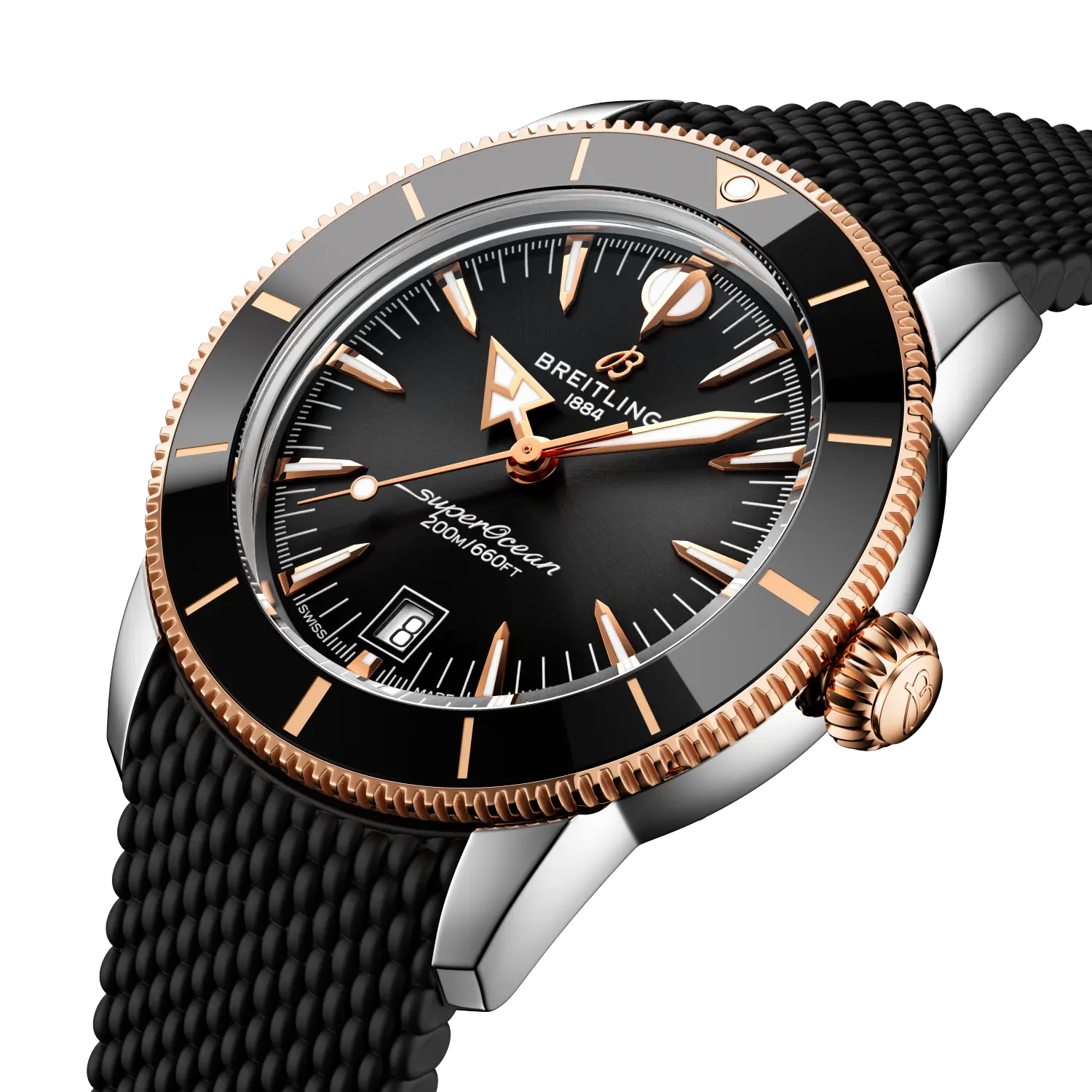 Sail into timeless elegance with the Breitling Superocean Heritage B31 Automatic 42, a sophisticated dive watch that balances performance and style. Housed in a 42 mm stainless steel case accented by 18k red gold, this model delivers bold aesthetics with refined detailing.