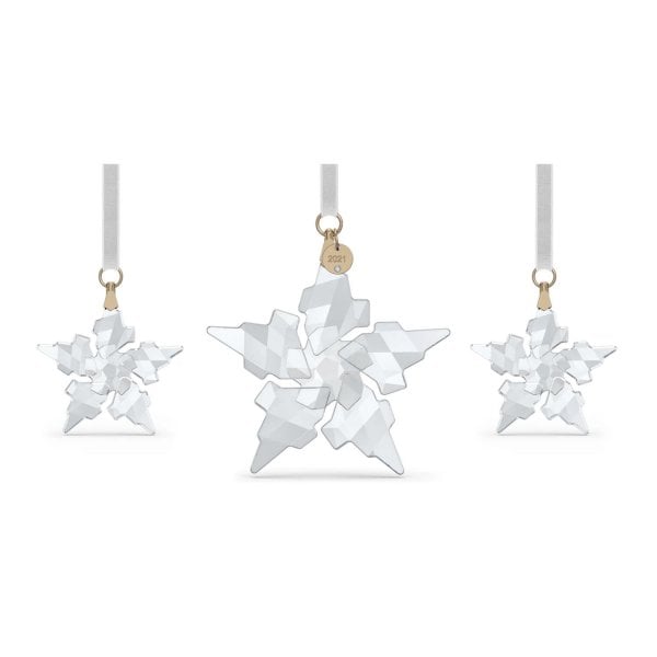 The Swarovski Annual Edition Ornament tradition continues into its 30th year with this beautiful set containing three stunning, crystal creations by Michele Blasilli. To celebrate its special anniversary, the larger Annual Edition 2021 Ornament has undergone a remarkable transformation to add contemporary appeal to its timeless design. The star has been expertly cut in an innovative, new asymmetric style to sparkle with 67 clear crystal facets, while the cream-white velvet ribbon and brushed champagne gold-tone, metal accents are fresh and modern. Exclusively available in 2021, its metal tag in a round shape is engraved with the year and embellished with a small crystal. It is joined in the set by two smaller versions of the same design. Perfect for hanging on a decorative tree or in a window, this trio of ornaments would make an elegant gift. Decoration object. Not a toy. Not suitable for children under 15.