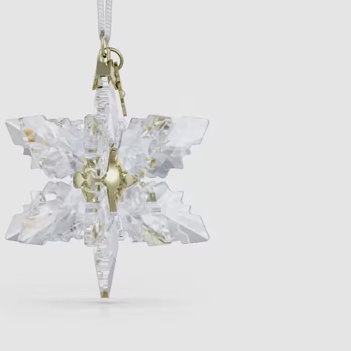 The magic of winter is captured in this year’s Swarovski Annual Edition 3D Ornament. Celebrating the unique beauty of snowflakes, the clear 3D design is a striking example of Swarovski savoir-faire, featuring 340 facets and 18 individual peaks. Suspended from a white grosgrain ribbon, the ornament is completed with a glossy champagne gold-tone centre and a tag engraved with “2024.” Ideal for hanging in a window or from your tree, it will cast a wondrous light over any holiday décor scene. Decoration object. Not a toy. Not suitable for children under 15.