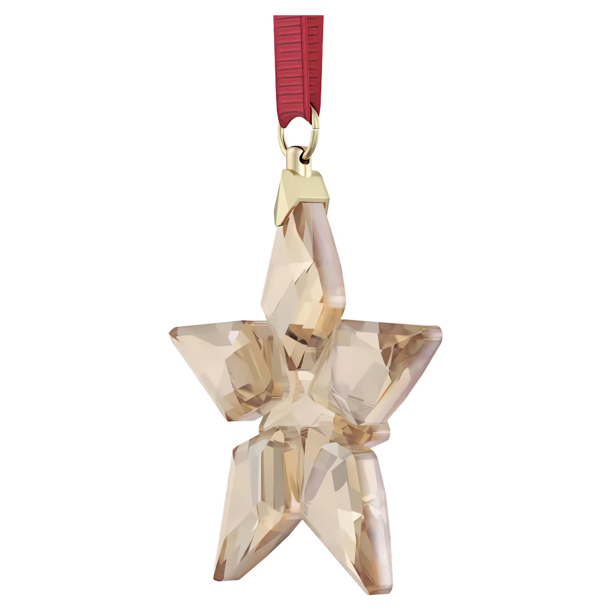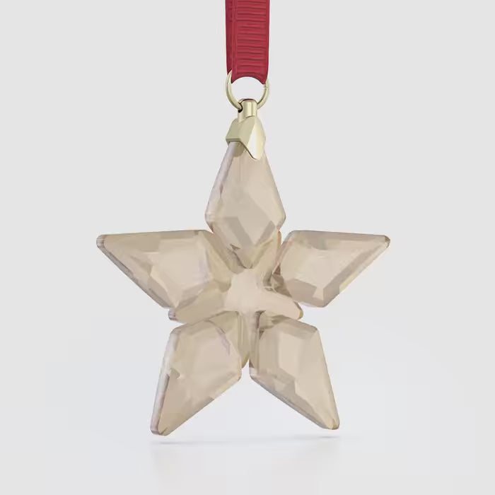 Enjoy a delicate touch of holiday magic with this small Annual Edition Festive Ornament inspired by the harmony of nature and science, which is brought to life by Swarovski's unmistakable savoir-faire and expert precision. 2023's golden coloured star design is crafted with 97 facets and suspended from a red grosgrain ribbon with gold-tone plated accents. This wondrous ornament would make an elegant gift for a loved one, or add some festive shimmer to your own home décor. Decoration object. Not a toy. Not suitable for children under 15.