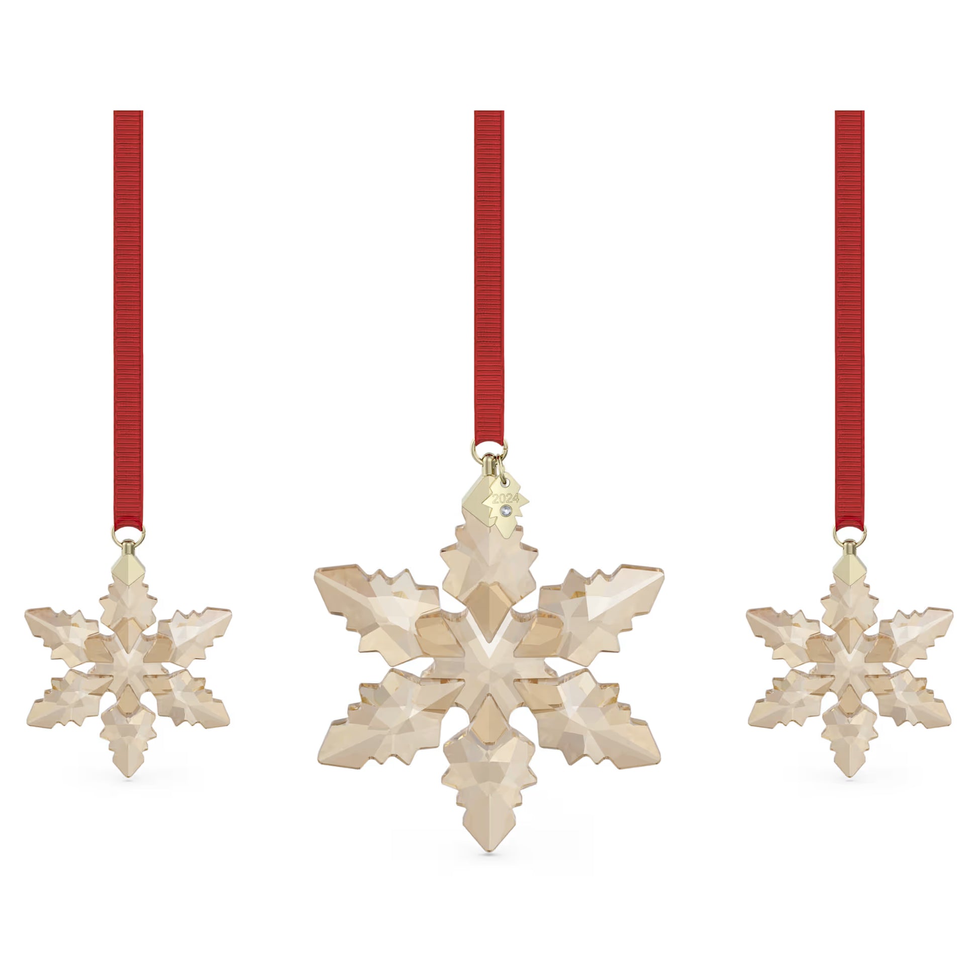 This glistening holiday set continues the beloved tradition of Swarovskis Annual Edition Ornaments. The trio of gold-tone pieces takes inspiration from the unique beauty of snowflakes, realised with Swarovskis unmistakable savoir-faire and mastery of precision. The set includes two smaller pieces and one large focal piece, showcasing 399 facets in total. Each snowflake is suspended from a red grosgrain ribbon with glossy champagne gold-tone accents, with the large snowflake also featuring a tag engraved with 2024. Designed for the holiday season, this commemorative set would make a truly spectacular gift or brilliantly illuminate your own festive décor. Decoration object. Not a toy. Not suitable for children under 15.