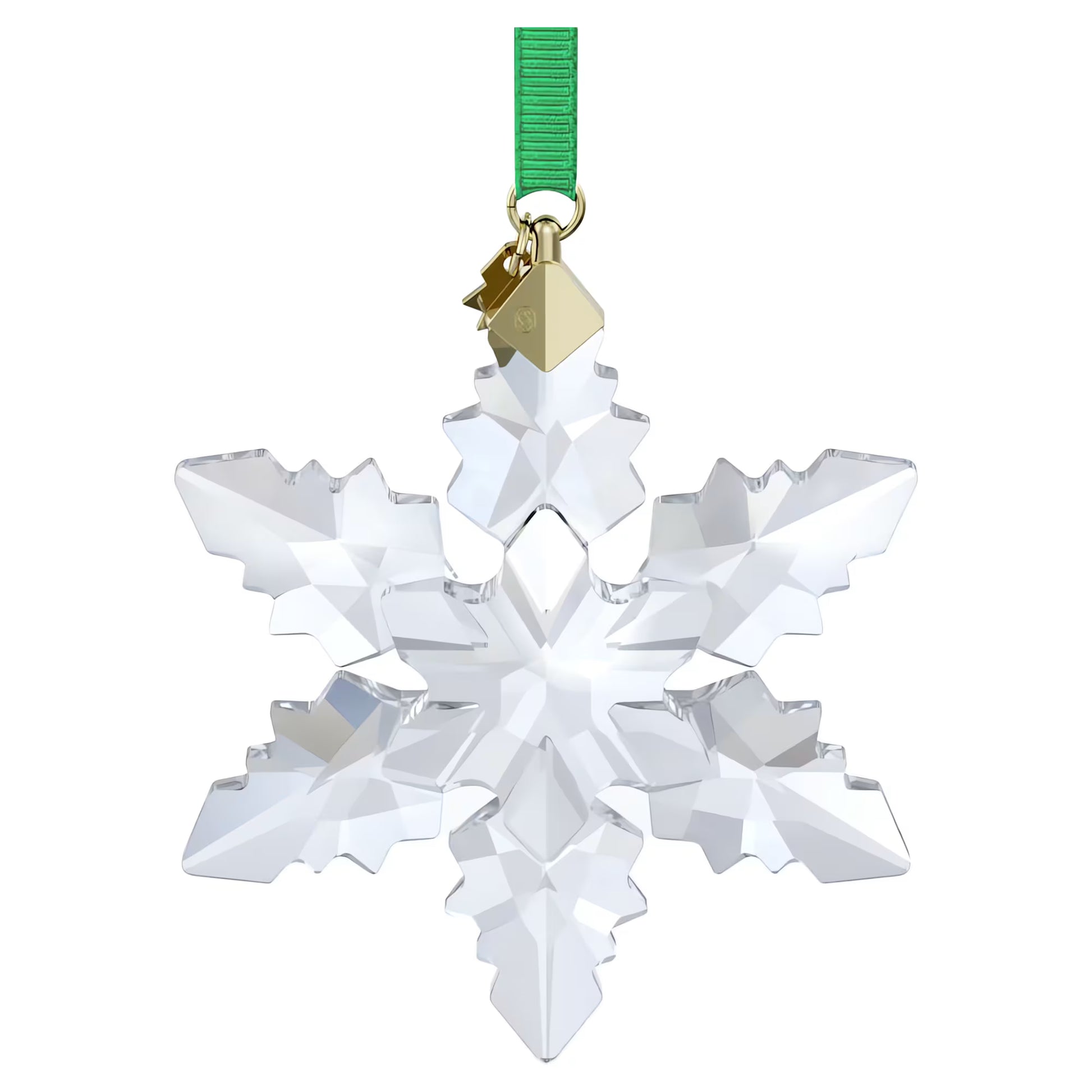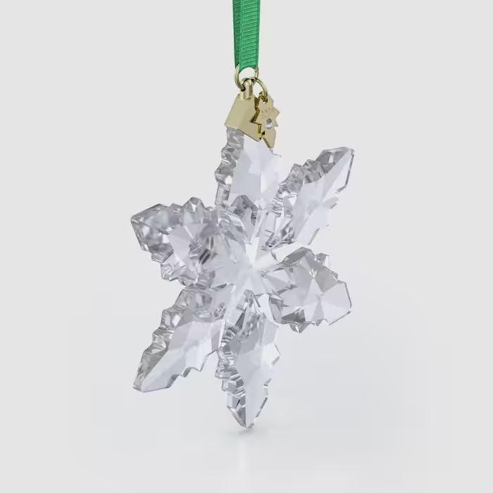 Our much-loved tradition of Annual Edition Ornaments continues in 2024 with this beautiful snowflake creation. Finely crafted with 133 facets, the clear design offers a fresh interpretation of the classic festive motif. Hanging on a green ribbon, the geometric piece features a gold-tone metal snowflake tag, which is engraved with the year and embellished with a small chaton. Use it to decorate a tree, hang in a window, or show alongside one of our elegant Christmas Ornament Home Displays or Bell Jars. Decoration object. Not a toy. Not suitable for children under 15.