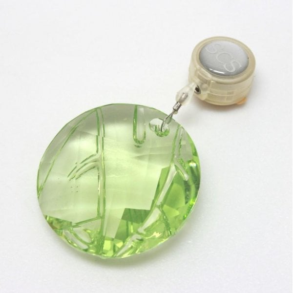 Made from peridot green crystal and has a retractable wire with a sticky pad on the rear.