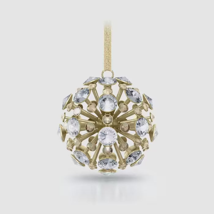 Light up your festive decorations with this spectacular ball ornament on a gold-tone lamé ribbon. Inspired by the geometric look of our Constella jewelry family, it blends warm, timeless colors with an innovative 3D silhouette. An explosion of 85 clear and gold-colored crystals, with 1,936 facets, shimmer in brushed champagne gold-tone plated metal settings. A brilliant gift idea, or a luxurious highlight for your own holiday décor. Decoration object. Not a toy. Not suitable for children under 15.