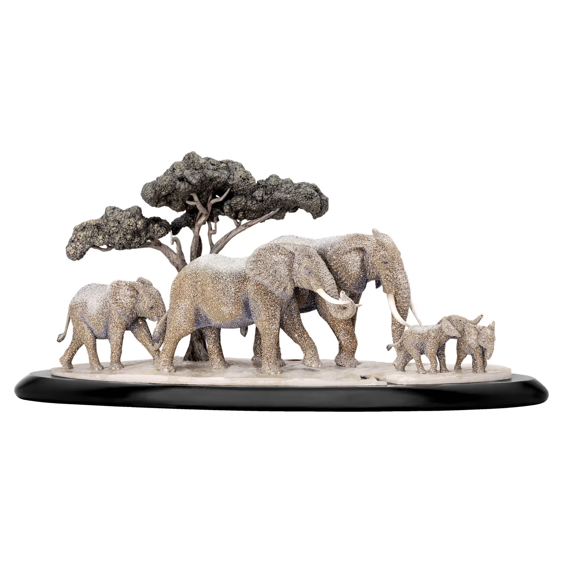 Capturing the beauty of the African savannah, this Limited Edition Crystal Myriad masterpiece shows a family of elephants, with the mother and grandmother watching carefully over the younger generation. Embellished with more than 100,000 hand-set crystals using our signature Pointiage® technique, each piece takes 550 hours to complete. Adhimu, the name of the piece, means 'majestic' in Swahili - a reference to the strength and beauty of these gentle giants. Only crafted on demand, this unique statement piece comes with a certificate of authenticity and a premium blue suitcase. Decoration object. Not a toy. Not suitable for children under 15.