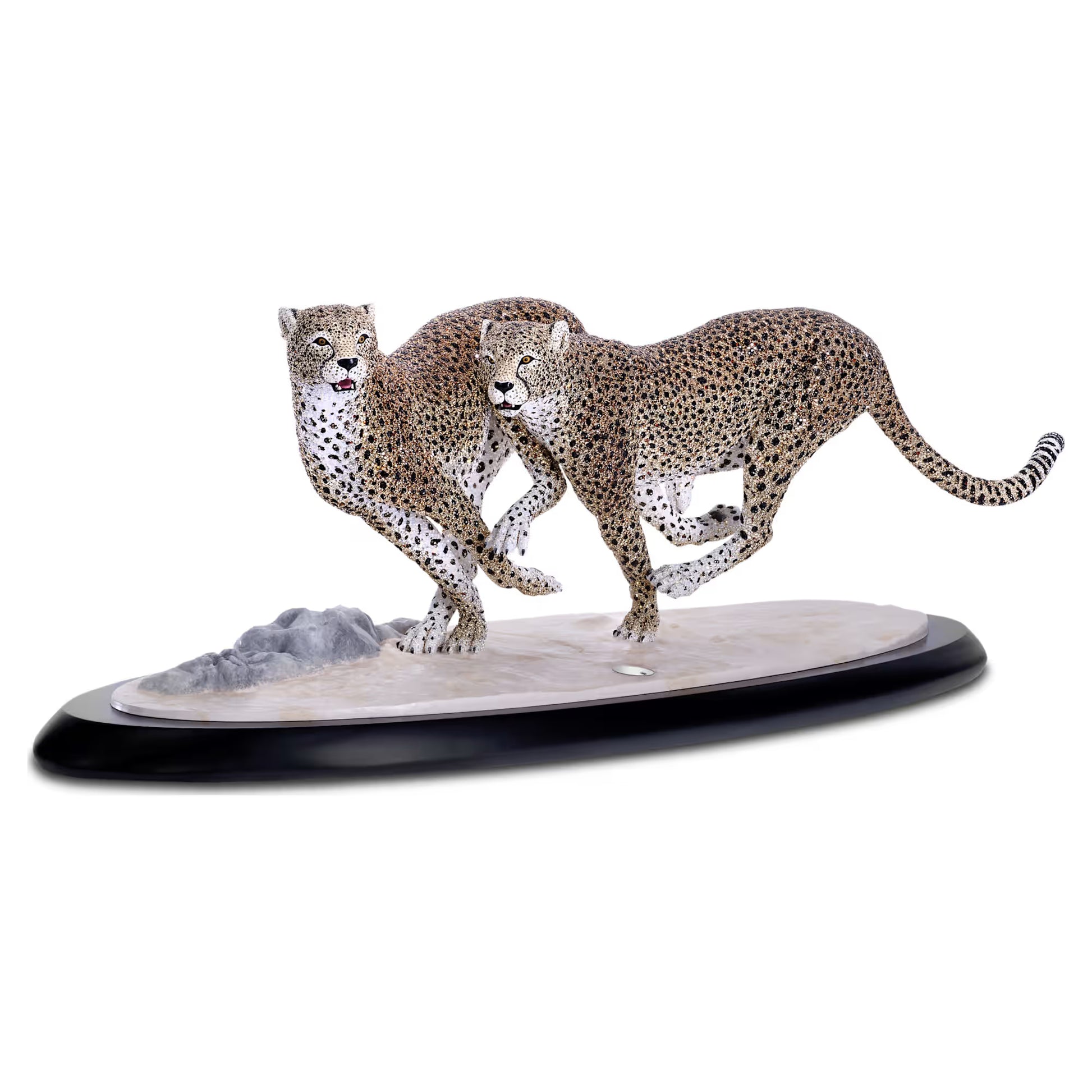 Captured in elegant and powerful motion, this exceptional sculpture displays the full potential of our Pointiage® technique, with an array of brilliant crystals that bring the animals to life. The dynamic design features two sprinting cheetahs on the African savannah, with typical tear-shaped stripes from the eyes to the mouth and spotted fur that is detailed to the highest level of mastery. The name Asuga means “swift” and “wind”, a perfect representation of the style of this piece. This creation will enhance any home as a testament to the uniqueness and beauty of these animals, as well as the importance of protecting their delicate habitat. This piece is made to order. Decoration object. Not a toy. Not suitable for children under 15.